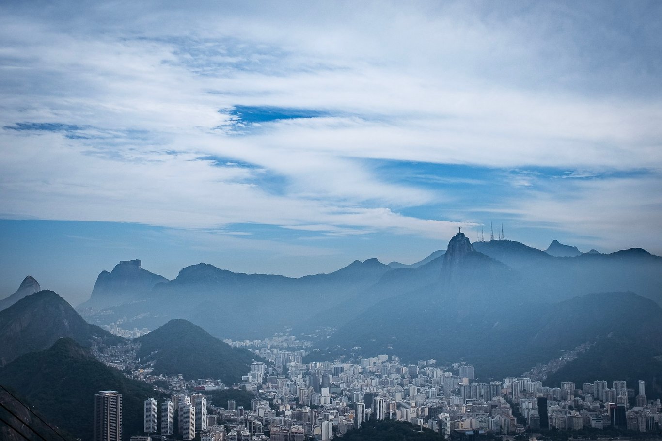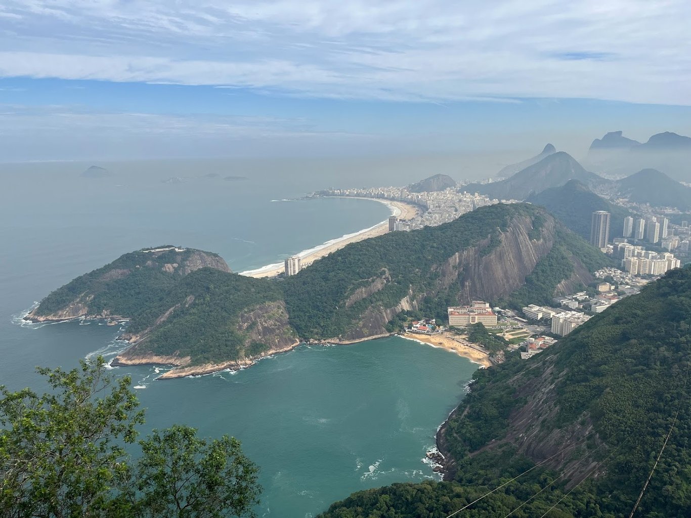 這兩塊巨岩均不秀美。 身在纜車車廂中,近距離地觀望過去,甚至會覺得它們看似畸形。 卡耶塔諾早就唱過了:“O antropólogo Claude Lévi-Strauss detestou a Baía de Guanabara / Pareceu-lhe uma boca banguela”(人類學家克勞德·李維史陀憎惡瓜納巴拉海灣 / 在他眼中仿如一個缺牙的嘴巴),雖沒對此二山指名道姓,「残齒」確是傳神寫照。 幸而纜車行程很短,一達山頂,遊人疏朗,天高氣清,而遠處煙霞如紗,瀰漫於登高者與一個群山蔥茏的大城市之間:鳥瞰下去,無數的海灘、遊艇、樓宇,繁華喧囂的所在,到了高處皆聲息毫無,令我忽然若有領悟,彷彿明白了為何偏偏是這個城市會產生波薩諾瓦,一種現代的都會音樂,而近乎天籟,又常常充滿一種莫名的迷茫悵惘。 (歷史家評說波薩諾瓦代表崛起的中產階級趣味,但另一方面,誰能夠說創作不會與風土息息相關? )里約不是紐約,它是都市卻不必使人沉浸、加速,相反,它離自然那麼近,不難超脫出來。 我們變得很快樂。