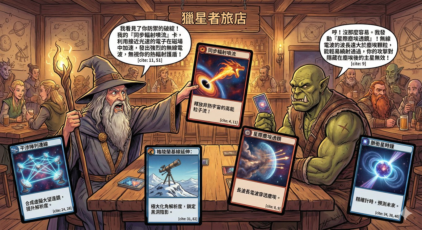 巫師高舉著卡牌,大喊:「我看見了你防禦的破綻!我的『同步輻射噴流』卡能利用接近光速的電子在磁場中加速,發出強烈的無線電波!」;而半獸人則一臉自信,打出「星際塵埃透鏡」進行防禦,冷靜地反駁道:「無線電波的波長遠大於塵埃顆粒,能輕易繞射通過,你的攻擊對隱藏在塵埃後的主星無效!」