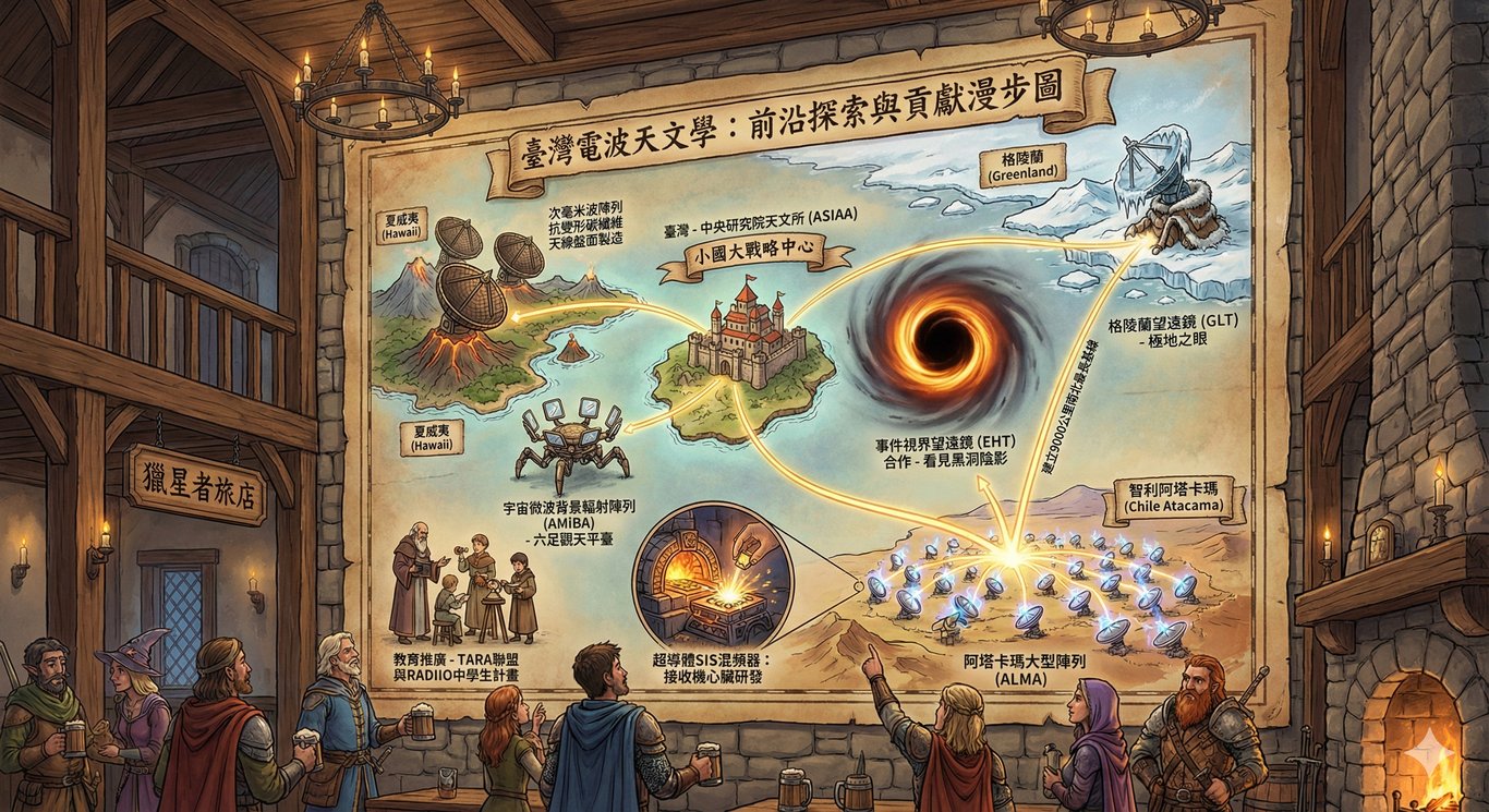 只見畫面隨即生成,溫暖昏黃的燭光映照著充滿木質與石材紋理的旅店大廳,眾多身穿披風的冒險者與矮人正圍聚在牆邊,抬頭仰望那幅佔據了整面石牆的巨型羊皮紙地圖。地圖標題赫然寫著「臺灣電波天文學:前沿探索與貢獻漫步圖」,原本生硬的科學據點被轉化為生動的奇幻地標:中央代表中研院天文所的「小國大戰略中心」化身為一座指揮全局的雄偉城堡,並透過散發光芒的金色路徑,連接至極地冰原上的格陵蘭望遠鏡、火山群中的夏威夷陣列,以及沙漠深處的阿塔卡瑪大型陣列。圖中更細膩描繪了彷彿機械巨獸的AMiBA六足望遠鏡與如同鍛造神器的SIS混頻器研發場景,而巨大的黑洞暗影則如神秘深淵般盤踞一方,完美地將台灣在全球電波天文學的佈局,轉譯成了一場激動人心的史詩冒險版圖。