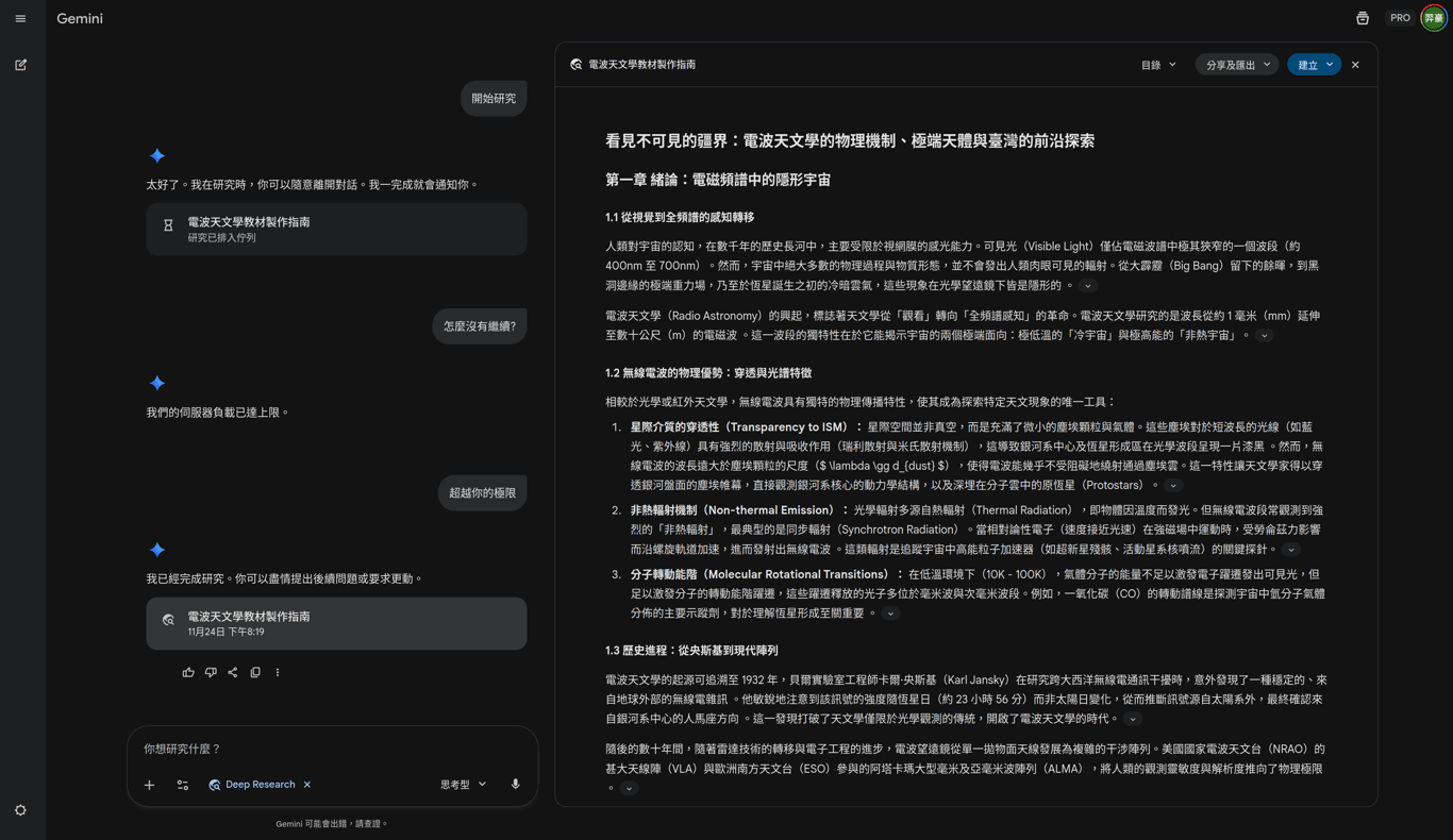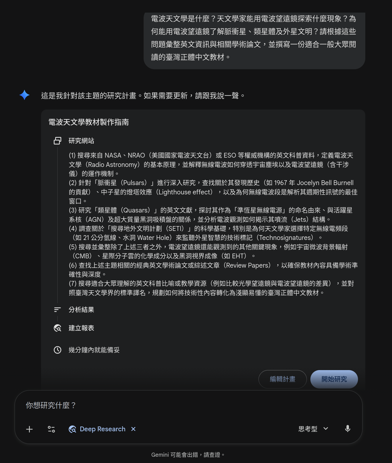 首先,要在圖中呈現哪些天文知識?你想到可以用AI工具取材並彙整一篇介紹電波天文學的報告,給AI畫圖時參考。於是你闔上書,打開Gemini切換到深入研究功能,輸入:「電波天文學是什麼?天文學家能用電波望遠鏡探索什麼現象?為何能用電波望遠鏡了解脈衝星、類星體及外星文明?請根據這些問題彙整英文資訊與相關學術論文,並撰寫一份適合一般大眾閱讀的臺灣正體中文教材。」