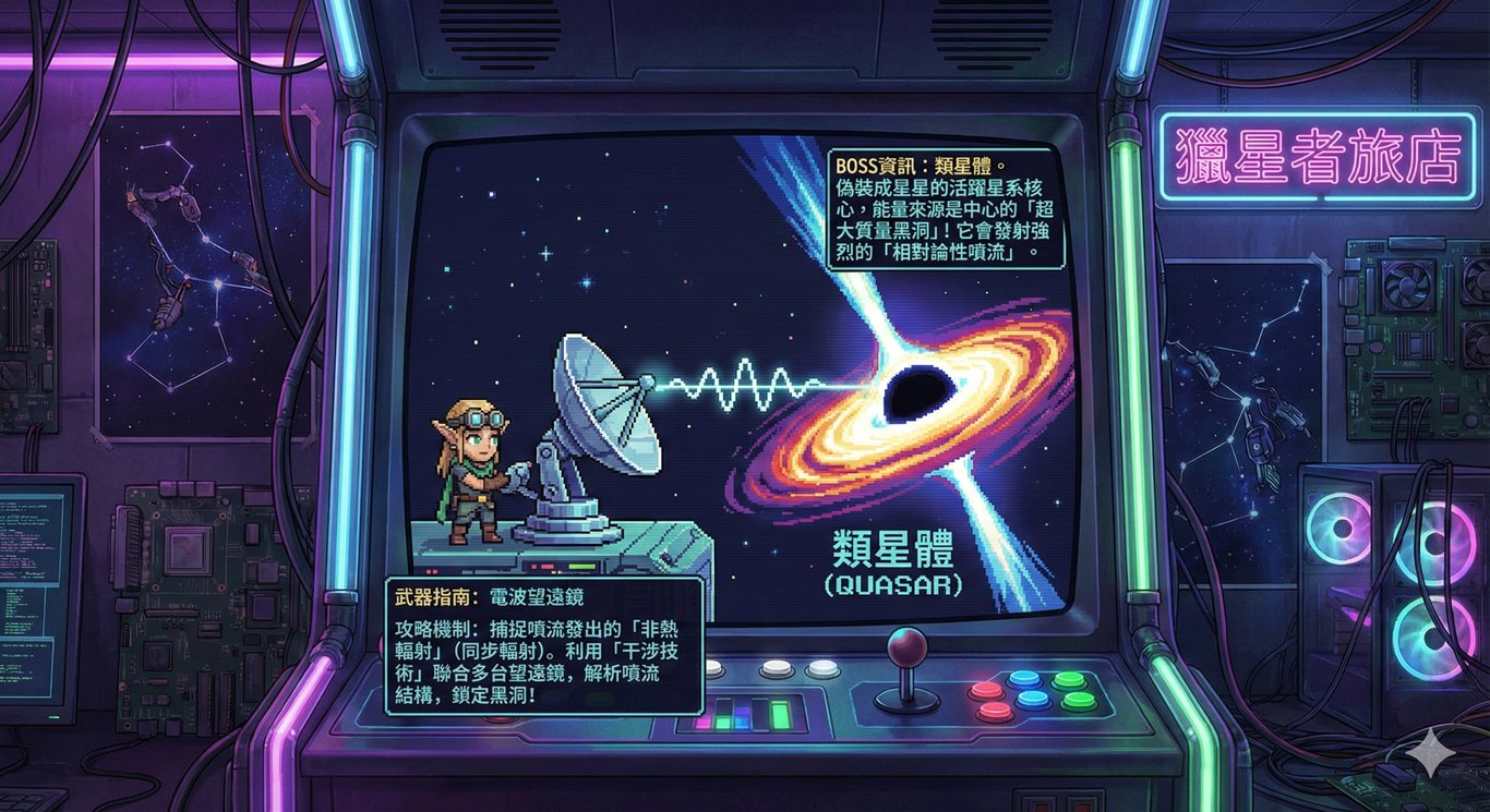 隨著指令執行,眼前隨即浮現出一台沐浴在霓虹紫光中的大型遊戲機台,螢幕上正上演著一場復古像素風格的星際對決:一位配戴護目鏡的精靈熟練地操作著電波望遠鏡,向右方那擁有巨大吸積盤與噴流的「類星體」發射探測波束,而畫面兩側的資訊框巧妙地將科普知識轉化為遊戲介面,不僅揭示了這看似星星的BOSS其實是能量來源於超大質量黑洞的活躍星系核心,更將捕捉「非熱輻射」與利用「干涉技術」解析噴流結構的原理,包裝成玩家必須掌握的武器指南與攻略機制,生動地演繹了如何用天文物理知識擊敗宇宙魔物。