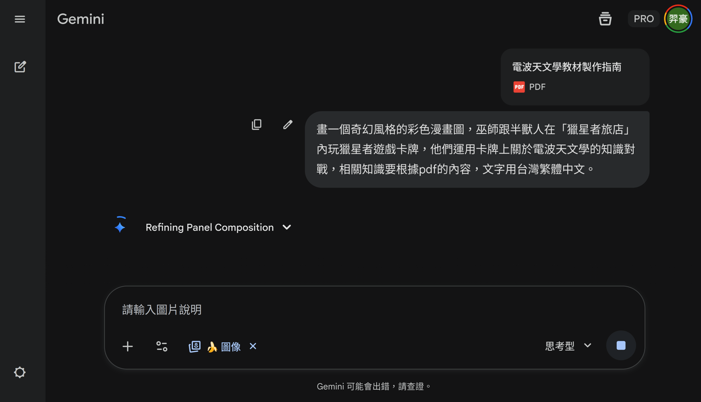 接著你在Gemini的工具選單中將「Deep Research」切換到有一根香蕉圖示的「建立圖像」,並上傳轉成PDF的報告,然後在對話框開始輸入:「畫一個奇幻風格的彩色漫畫圖,巫師跟半獸人在『獵星者旅店』內玩獵星者遊戲卡牌,他們運用卡牌上關於電波天文學的知識對戰,相關知識要根據pdf的內容,文字用台灣繁體中文。」