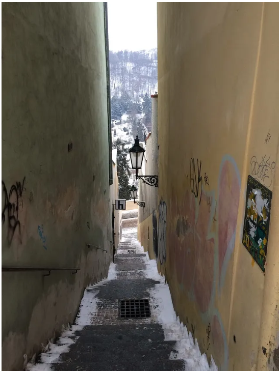 就這麼在積雪的山徑裡走著,我的目標是 Strahovská knihovna ,