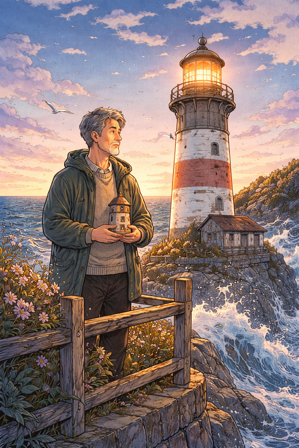 离开的那天,阿远没有带走太多东西,只有几本书,几封珍贵的信,和那个小男孩送给他的木雕灯塔。当他走下最后一级台阶时,回头看了一眼这个陪伴他二十年的地方。灯塔依然矗立在那里,顶部的灯已经由小林点亮,在黄昏中散发着温暖的光芒。