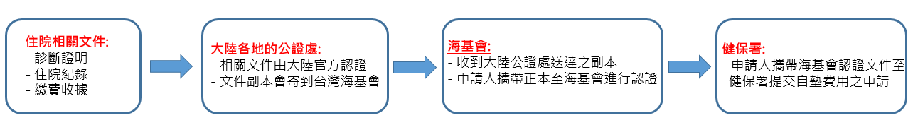 聽起來很複雜對不對? 告訴大家,辦起來也真不輕鬆。我還在深圳住院時,幾位同事就傳訊息跟我說海外就醫的文件要做一些公證程序,回台後不管是健保或是其他保險公司才會理賠。我把這流程簡化如下: