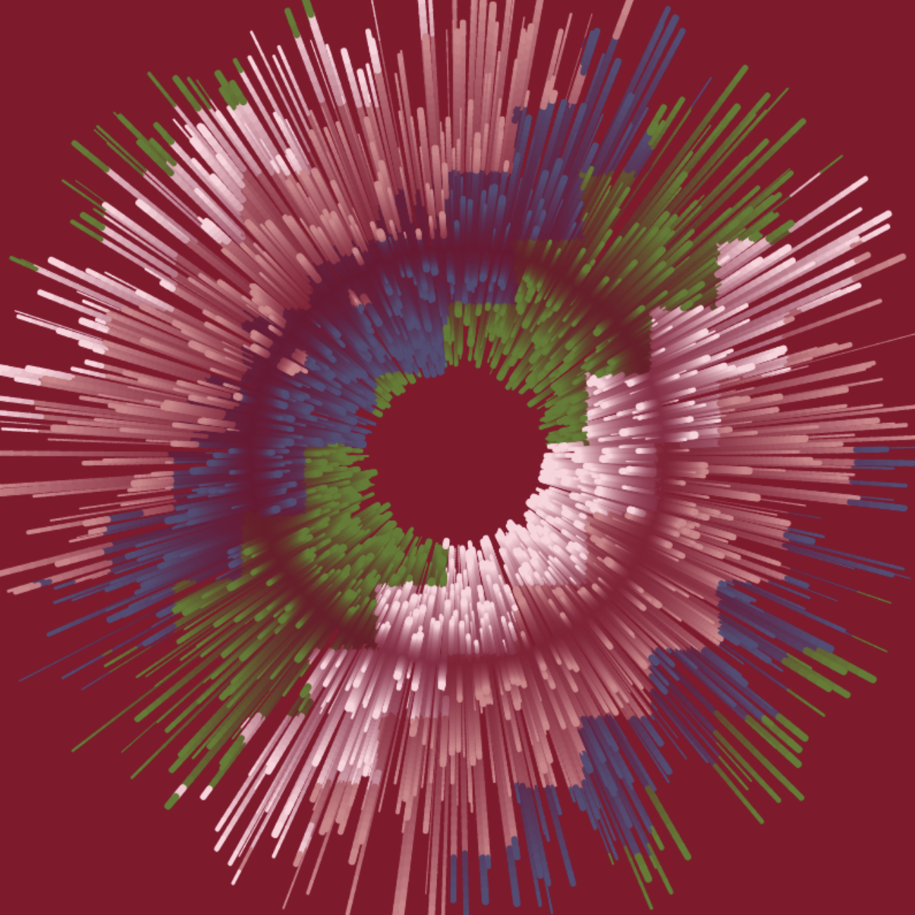 再來第二件作品《Particle Swarm》使用大量長直條的 3D 感筆刷素材向外擴張,既像爆炸又像開花,這樣的脈動感與立體深度讓我感受到作品的生命與能量。