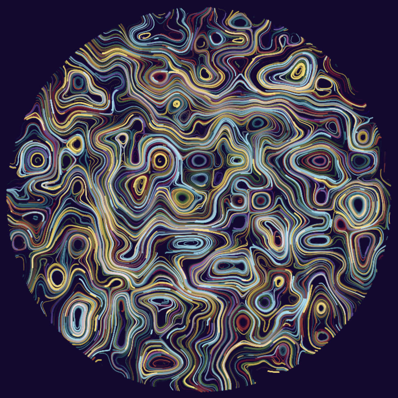 最後一件作品《flow》使用流動噪波與等高線式的筆觸描繪,線條層層堆疊,形成像地形圖也像細胞切片的紋理。色彩以暖冷交錯色調組成,線條柔和卻具立體感,讓作品以數位的風格呈現像細胞膜、礦物紋理、樹木年輪等自然中的複雜紋理。營造安靜、流動且深邃的美學氛圍。