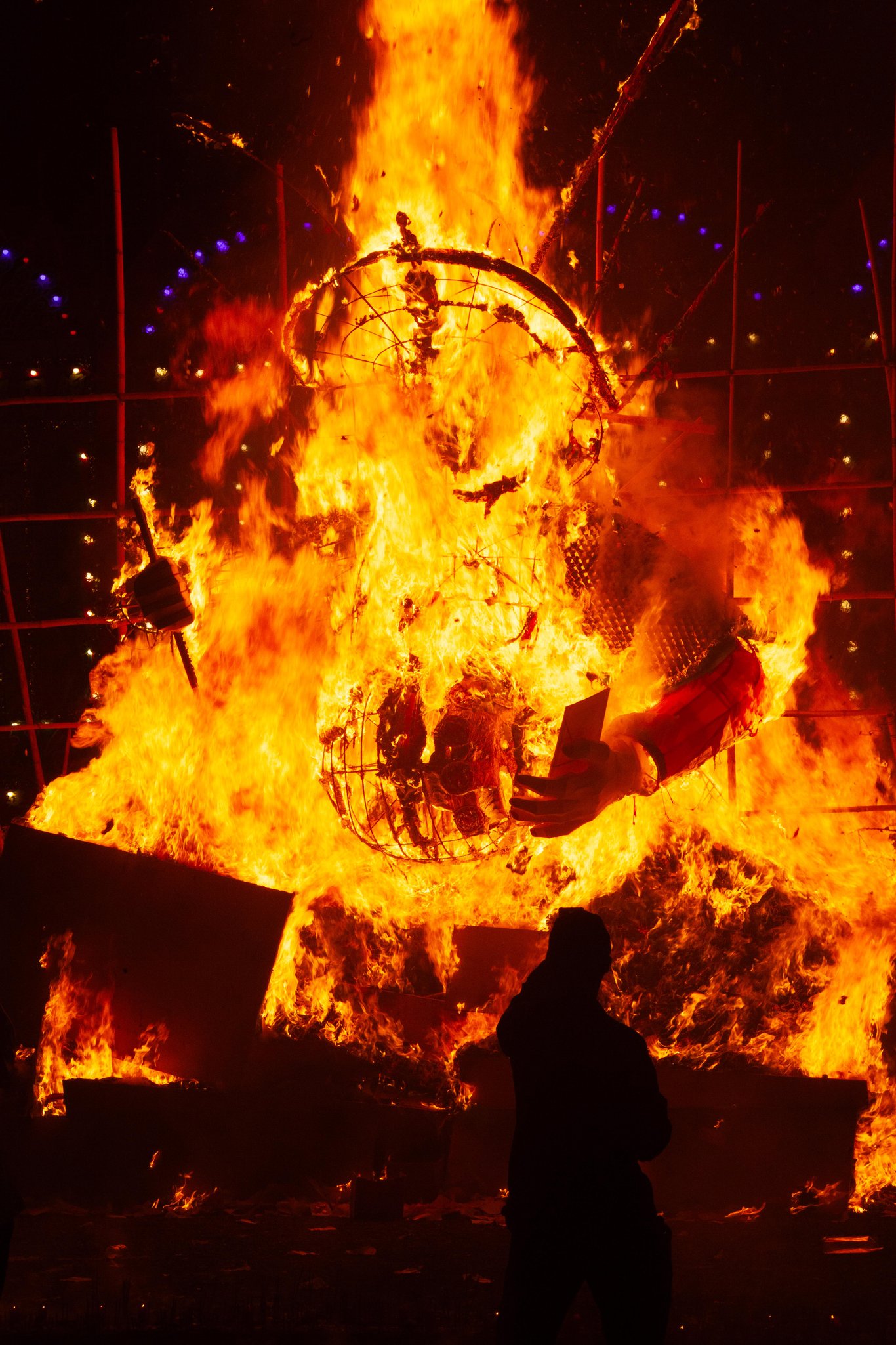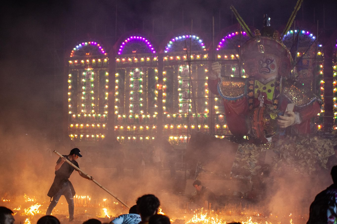 工作人員用竹把祭品撥開,方便燃燒