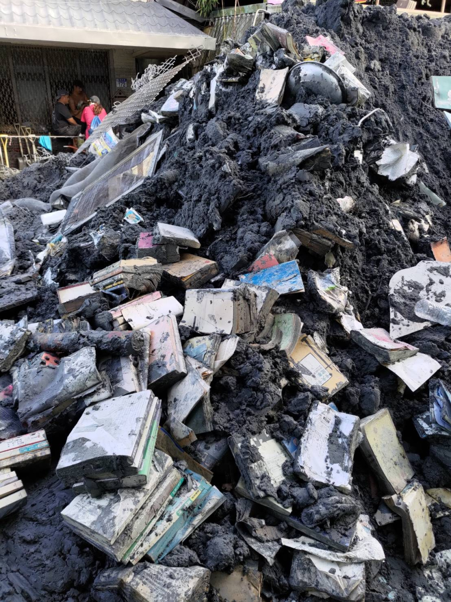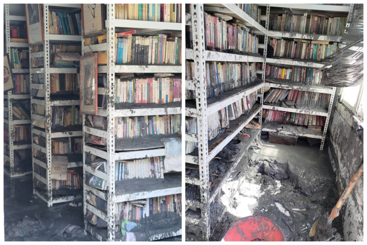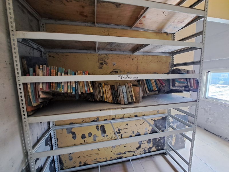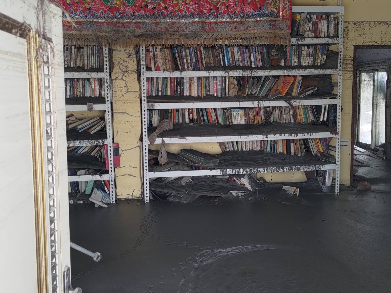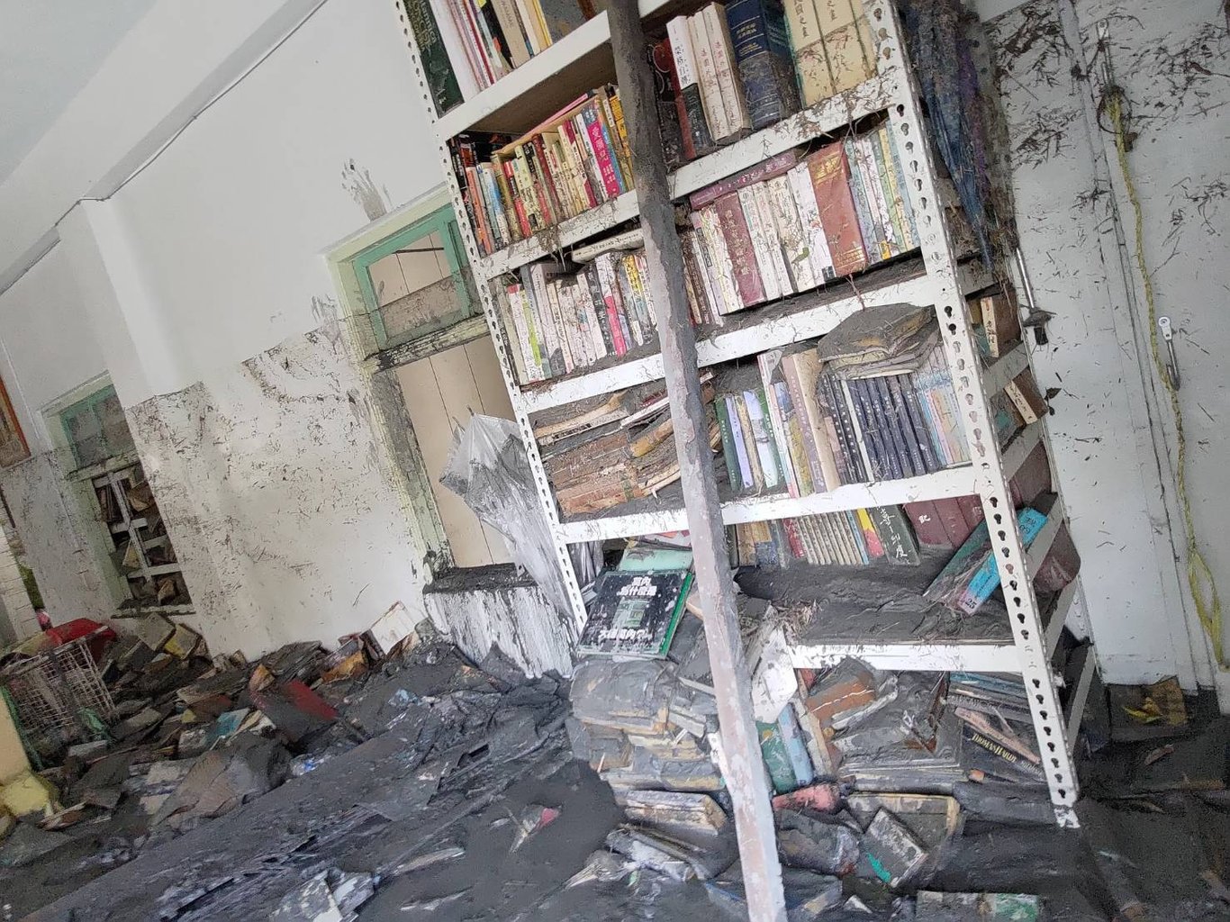 然而,洪水摧毀了這些書——泥水沖向書櫃,淤泥裹住靠近下方幾層的書,成為泥磚;而中層書櫃的書被泥水力量沖刷變形,呈現波浪狀,且緊緊黏附在一起。上層書櫃稍微完整,但也浸水濕潤,需要整理。據劉柳書琴初步計算,保留下來、沒有丟棄的(但不代表可以攤開、修復)的書冊,不到10分之1,「可能連15分之1都不到。」