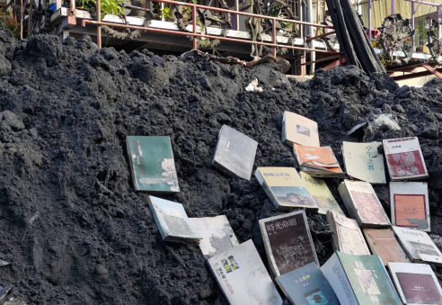 半個月過去,除了被黏著在書櫃上無法移動的書冊外,赫恪住處被保留下來的書,大多都已被清理數次,抖掉泥沙、曬過太陽,顯得乾爽不少,但淤泥包裹過的痕跡仍很是清晰,有的書甚至連同泥塊直接裝箱擺置,宛如一種裝置藝術。