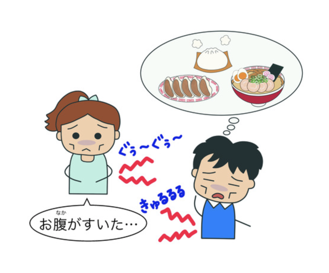 究竟,肚子餓日語怎說呢?我最愛是其擬音詞:肚子咕咕叫的ぐうぐう和表示餓扁了的ぺこぺこ,常與「お腹 (おなか)」結合,如「お腹がぐうぐう(する)」(肚子咕咕叫)或「お腹がぺこぺこ」(肚子很餓,有點像小孩子說法)。另外還有「腹が減った (はらがへった)」(男性常用)等說法,而擬態詞有「がつがつ」形容大口吃飯。這些都很有趣啊哈!