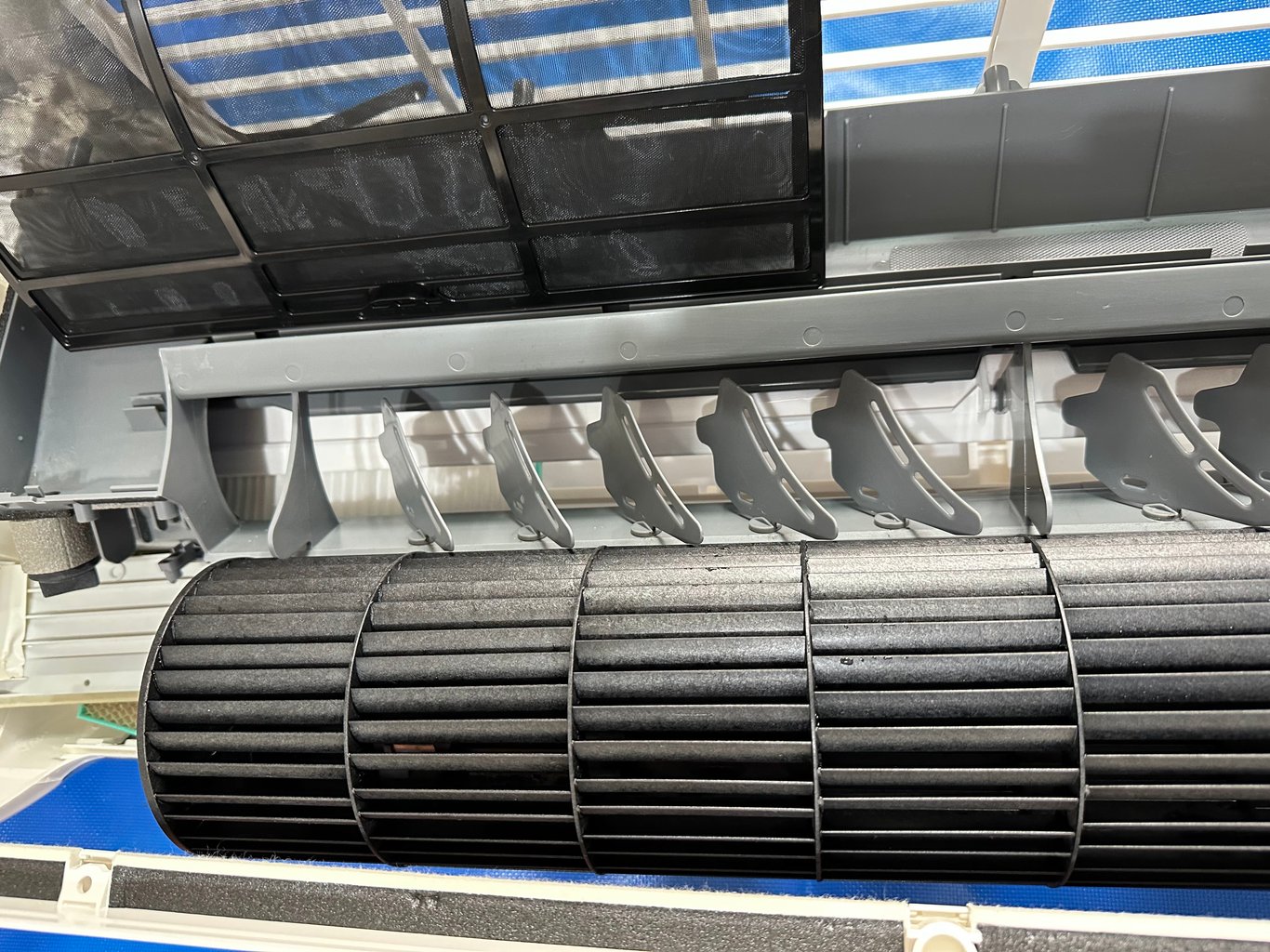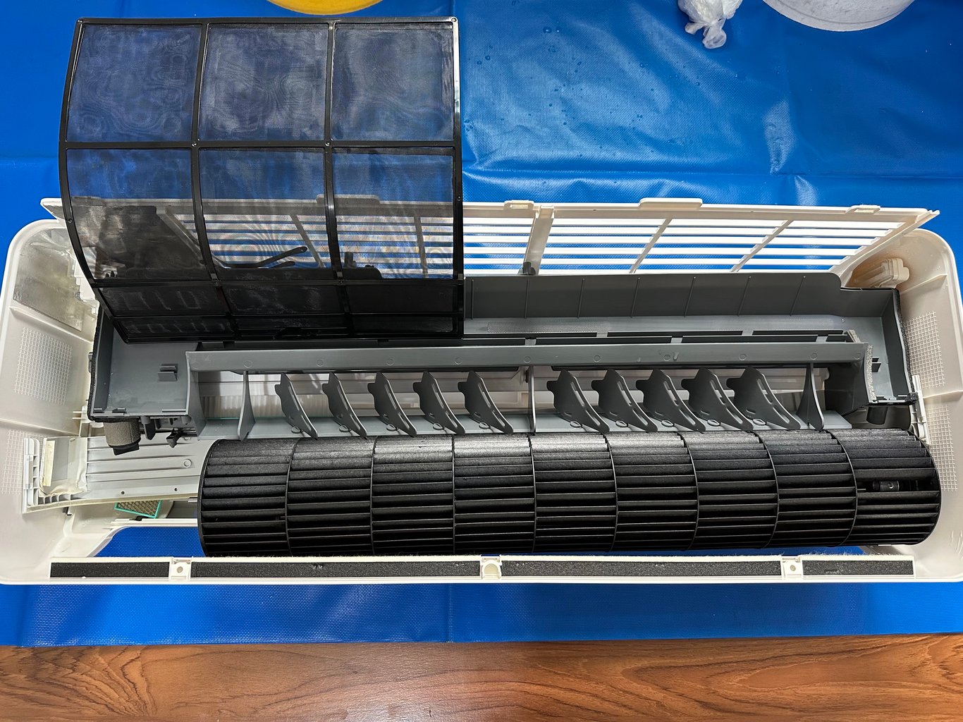 分離式冷氣內機零件、面板、濾網、風鼓和水盤清洗後~