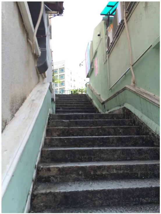 階梯連接了兩個不同的生活型態,當地居民與過往遊客匆匆地走過,