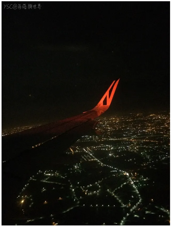 機翼上閃爍著紅色的防撞燈,輝映著地面上持續亮著的生活燈,