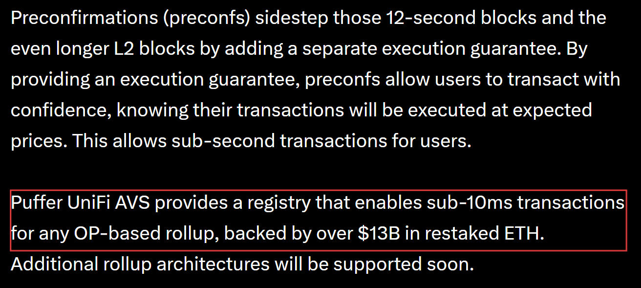 近期,Puffer Finance 推出的以太坊安全基础设施产品「UniFi AVS」,终于试图将 Preconfs 从临时性的性能补丁,升级为可复用的标准化基建,以带来 sub-10ms 的确认速度,并在安全与经济激励层面引入制度化设计。