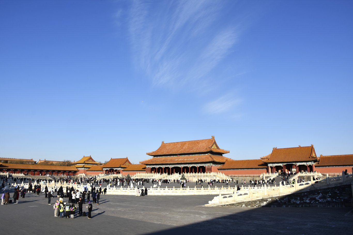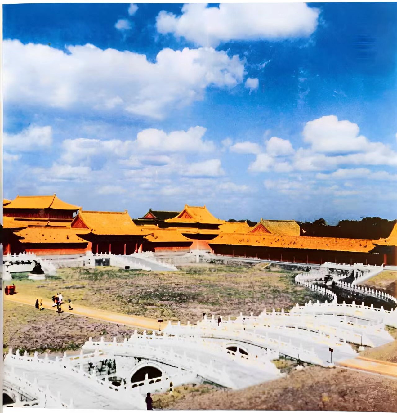 原圖說明是三大殿全景,其實畫面中是太和門與金水河,常說的三大殿是太和殿->中和殿->保和殿,而太和門建於明朝永樂十八年(西元1420年)並命名[奉天門],後於嘉靖三十七年(西元1558年)與嘉靖四十一年(西元1562年)分別改名為[大朝門]與[黃極門],現太和門之名是清朝順治二年(西元1645年)所改易的殿名號。