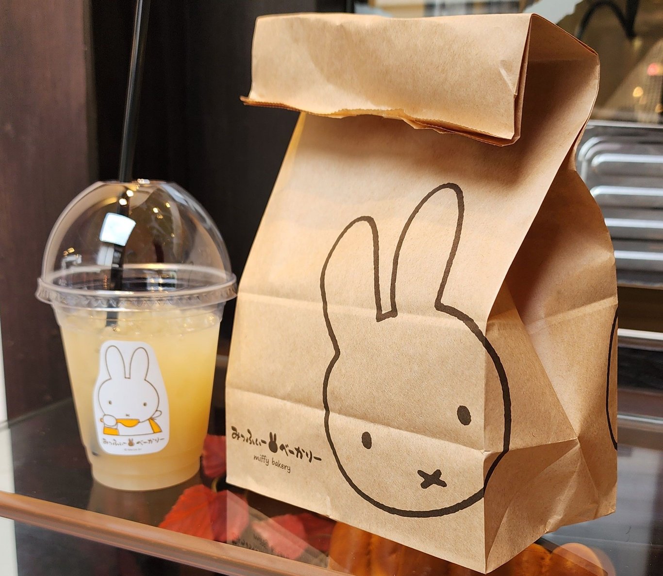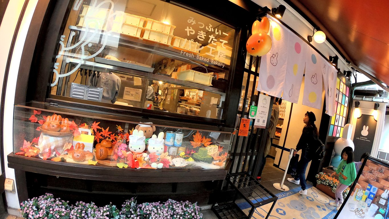 既然搭不到船,我們只好在周邊四處走走,順便尋找美味又特別的午餐。我們沿著河邊逛了幾間店鋪,意外發現了一間非常有趣的「miffy」米飛兔卡通造型麵包店,便 買了一個,配上一杯岡山出名的清水白桃果汁。