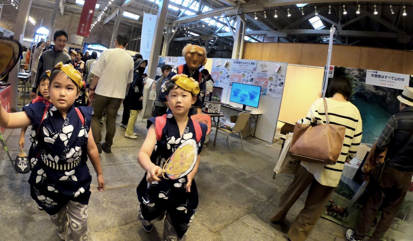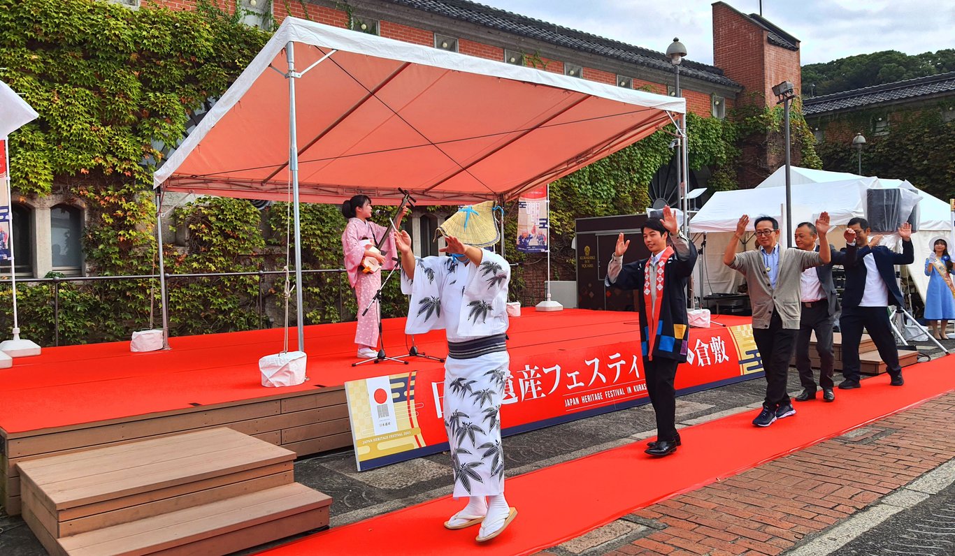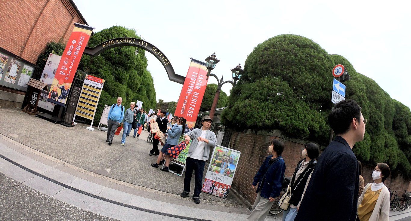 在河邊享用完卡通包後,我們步行前往倉敷常春藤廣場(Kurashiki Ivy Square )。今天剛好有慶典活動,人潮非常多,好像是一個當地特產展銷會,原來是「倉敷日本遺產節」。我們進去逛逛,發現有很多當地小孩子戴著面具走來走去,還會用扇子輕拍你的頭。雖然我不明白這是什麼意思,但感覺挺有趣的。