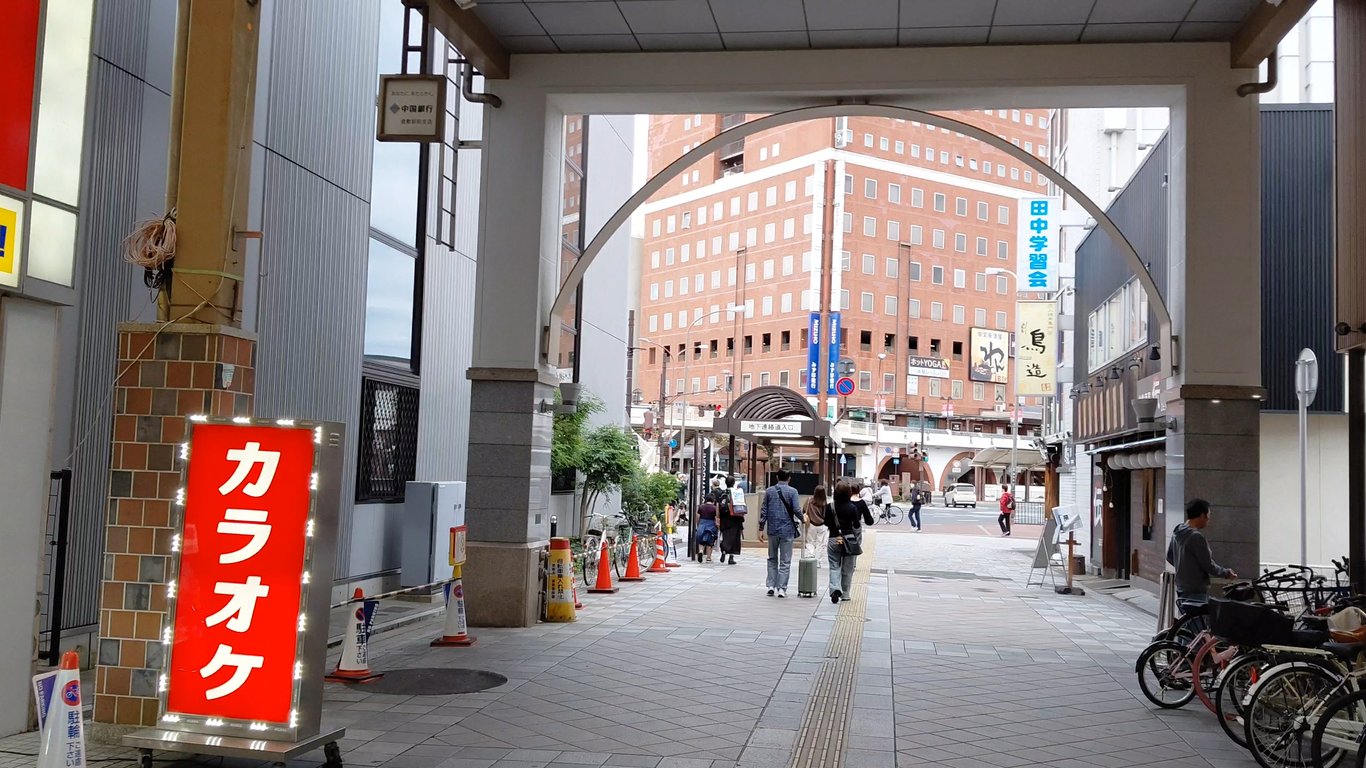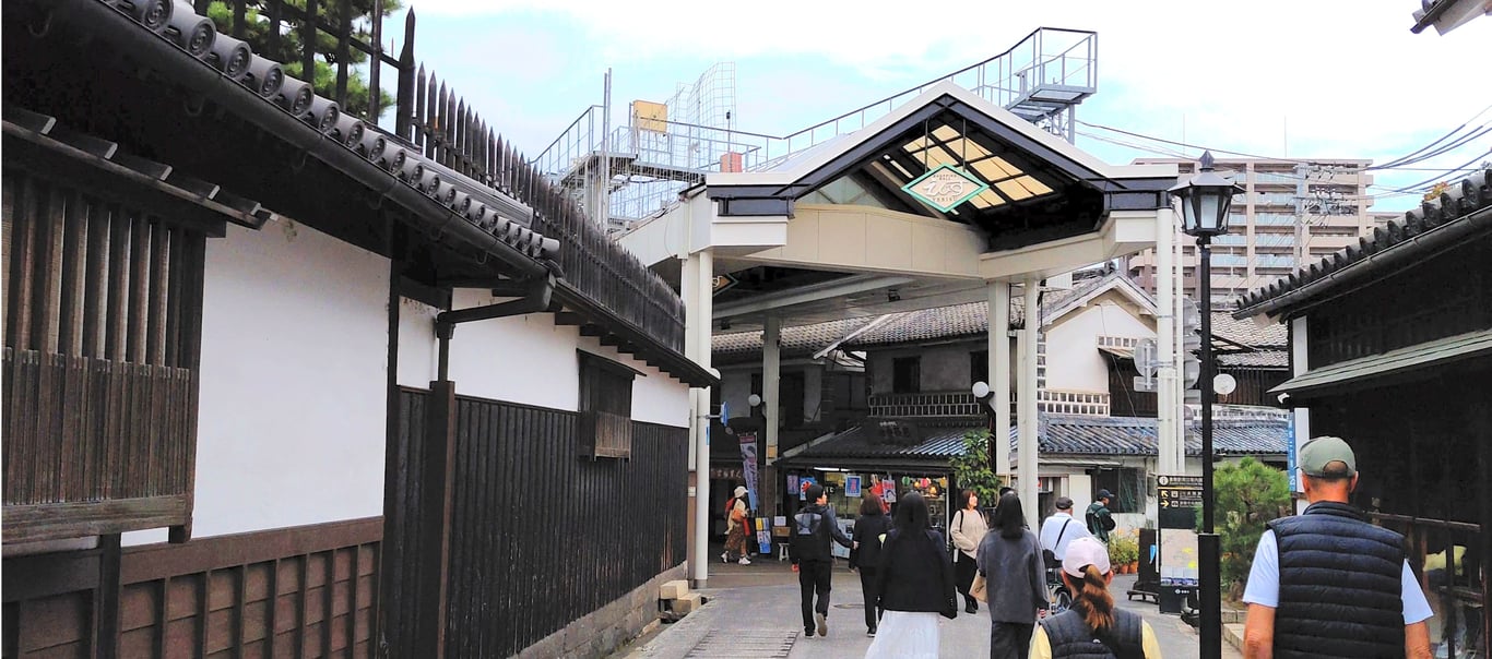在倉敷車站下車出站後,從南口出來左轉直走,穿過商場邊平台和天橋,就能看到商店街的入口。穿過商店街即可抵達「倉敷川」。不過,我是選擇從大街「倉敷中央通」背對JR車站直走幾條街就到了。