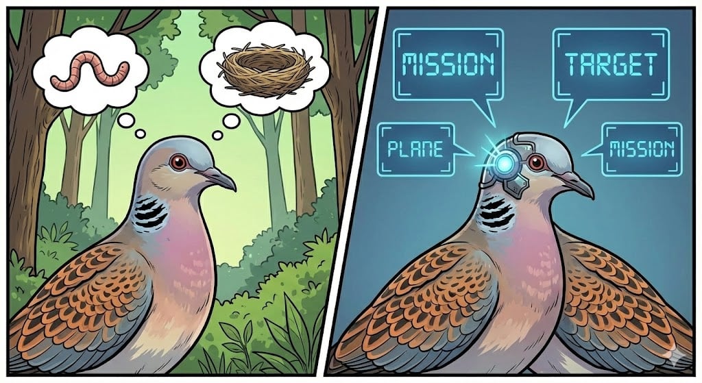 傳統軍用動物(如掃雷海豚或偵測犬)需長年訓練且任務單一,受限於條件反射。AI 轉譯能讓指令即時化、複雜化,使動物具備處理「非結構化任務」的能力。例如,透過轉譯指令,要求鳥類觀察特定窗口的活動並回傳其觀察到的語義訊息,使其從受訓生物躍升為具備情報蒐集能力的「特工」。
