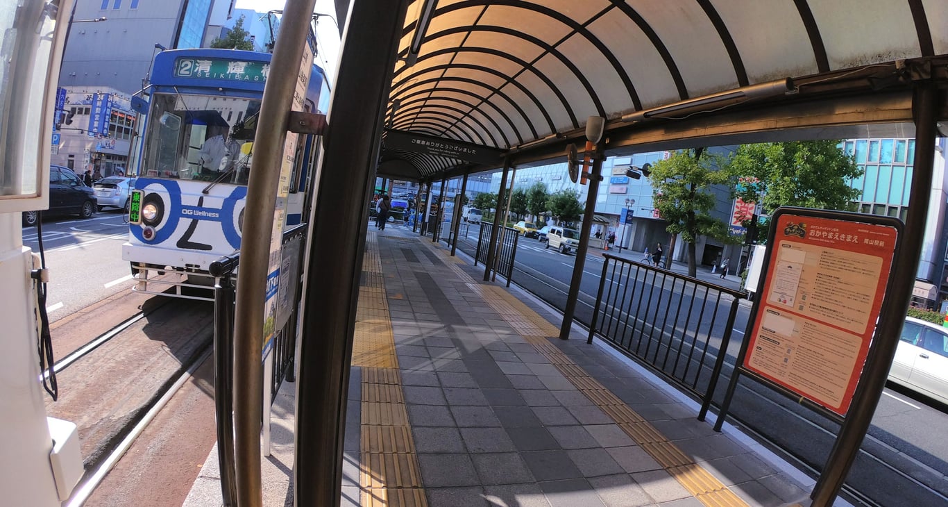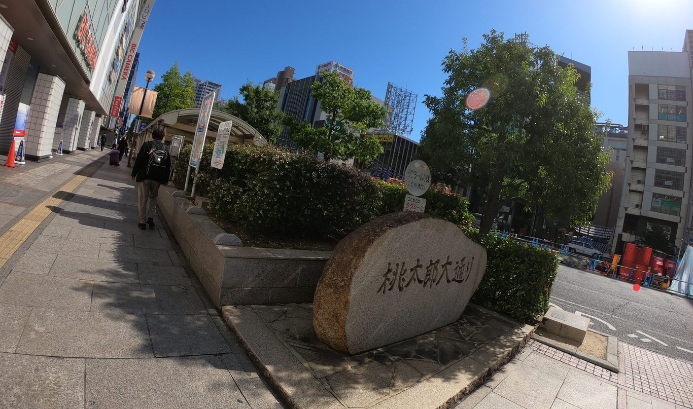 走出JR站,還沒過馬路,對面左邊就已經看見站前商店街了,不過我沒走過去看。右邊是主要大街「桃太郎大通」,一條很寬闊的馬路。街中央是當地的路面電車軌道,等一下可以坐坐看。其實主要的景點就是沿著「桃太郎大通」一直走就能到達,都是一條直路。電車我打算等回程走累了再坐。