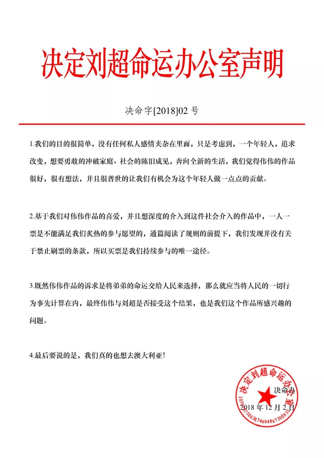 刘伟伟的弟弟刘超,拍出视频让观众投票,决定他是否移民澳大利亚,是《澳大利亚》这个项目的第二部分,也是相当引人注目的一部分。一开始移民选项的票居高,很快,刘超留在中国的选项,就被刷票了。当晚,刷票团的一员,就跑来跟我说了是他做的这件事,以及他们成立了“决定刘超命运办公室”,简称“决命办”,以及他们的其他计划……(我对他所告诉我的内容不会对外公开,除非他已经自己公开了)。昨天,“决命办”贴出一张公告,刘伟伟也对此回应,算是这项目带来的第一起波澜。我基于此,在朋友圈打下这段话: