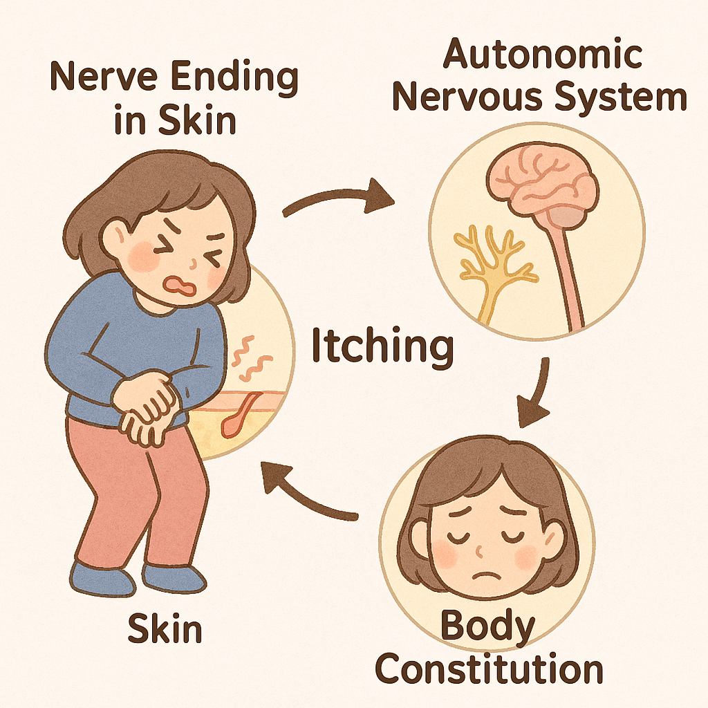 皮肤上布满感觉神经末梢,负责感知温度、触觉、疼痛与瘙痒。当外界刺激(如冷空气、摩擦、紧身衣物)较强或持续存在时,这些神经末梢会释放组胺、P物质等神经递质,引发局部炎症与瘙痒感。而神经系统敏感意味着我的感觉神经阈值较低,在同样的摩擦、温差情况下,我更有可能产生神经性瘙痒。