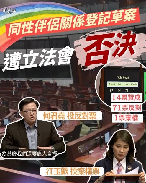 9月10日,香港立法会以14票赞成、71票反对、一票弃权的结果,大比数否决了香港政府提交的《同性伴侣关系登记条例草案》。该草案规定了同性伴侣若干类似于异性婚姻关系的权利,虽已考虑反LGBT平权的保守派顾虑颇有妥协、相较异性伴侣权利有很大落差,却仍然未能通过立法会表决。