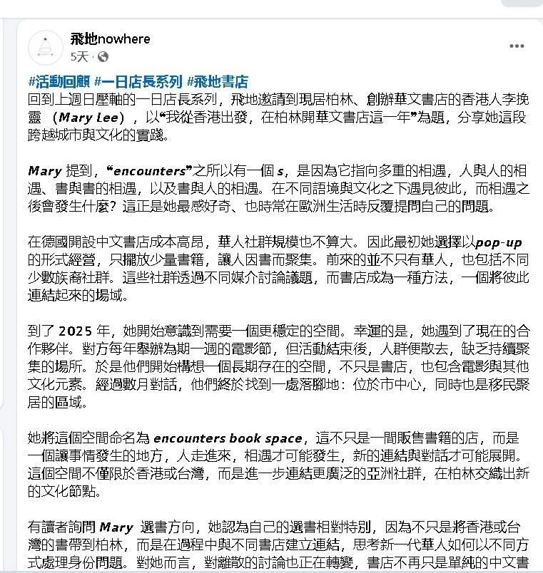 回到主題,早幾年香港出現獨立書店潮,近年隨著港人漂散海外的足跡,也有些中文書店和文化空間的新實踐。「明周文化」把目光移到東京、倫敦、柏林三地,看看香港人如何透過開辟閱讀空間,與當地進行文化交流,凝聚移居港人,甚至連結更廣的群體,同城或異鄉。也補充各地的大陸華人書店與出版。
