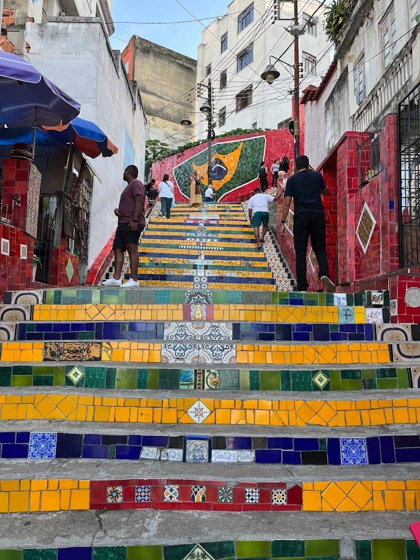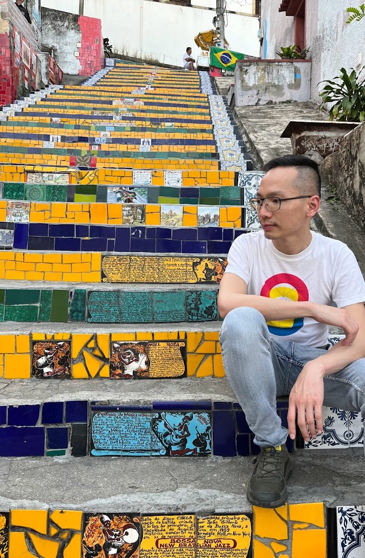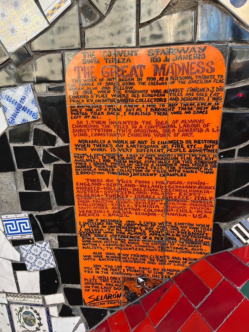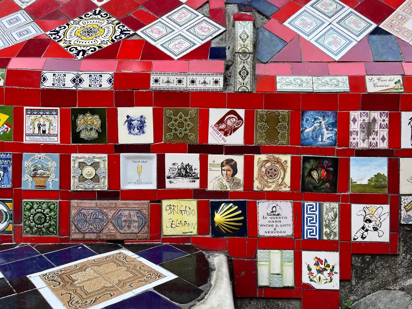 下午出門,首先走向塞拉隆階梯(Escadaria Selarón)。 當晚我在線上寫道:「我們住的民宿離它很近,在累到令我睡不著的夜機抵達后,稍事休息就去踏踏。 這位原籍智利的瘋狂藝術家(比卡耶塔諾還小四歲半,恰與家母同歲)死因成謎,或與捲入販毒團夥仇殺有關,卻也死得其所,倒臥在自己窮盡一生造出的彩瓷台階上⋯⋯牆畫中的他肩膀上歇著一隻鸚鵡,紅衫紅帽吐舌頭。 2000年,塞拉隆做了致敬巴西音樂的系列瓷磚,當然把卡耶塔諾也提到了,我在旁邊留個影。」 階梯令塞拉隆蜚聲國際,後期很多瓷磚是來自世界各地的捐贈。 我們發現了三藩市主題的那一級台階,拍了下來。