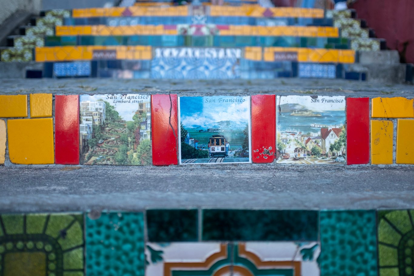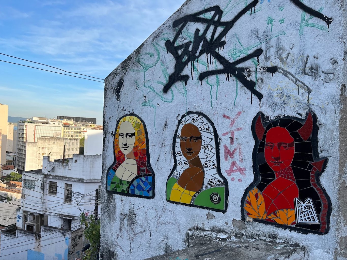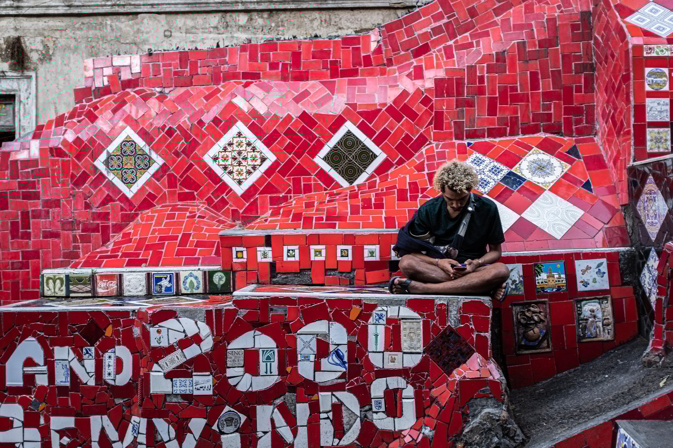 下午出門,首先走向塞拉隆階梯(Escadaria Selarón)。 當晚我在線上寫道:「我們住的民宿離它很近,在累到令我睡不著的夜機抵達后,稍事休息就去踏踏。 這位原籍智利的瘋狂藝術家(比卡耶塔諾還小四歲半,恰與家母同歲)死因成謎,或與捲入販毒團夥仇殺有關,卻也死得其所,倒臥在自己窮盡一生造出的彩瓷台階上⋯⋯牆畫中的他肩膀上歇著一隻鸚鵡,紅衫紅帽吐舌頭。 2000年,塞拉隆做了致敬巴西音樂的系列瓷磚,當然把卡耶塔諾也提到了,我在旁邊留個影。」 階梯令塞拉隆蜚聲國際,後期很多瓷磚是來自世界各地的捐贈。 我們發現了三藩市主題的那一級台階,拍了下來。