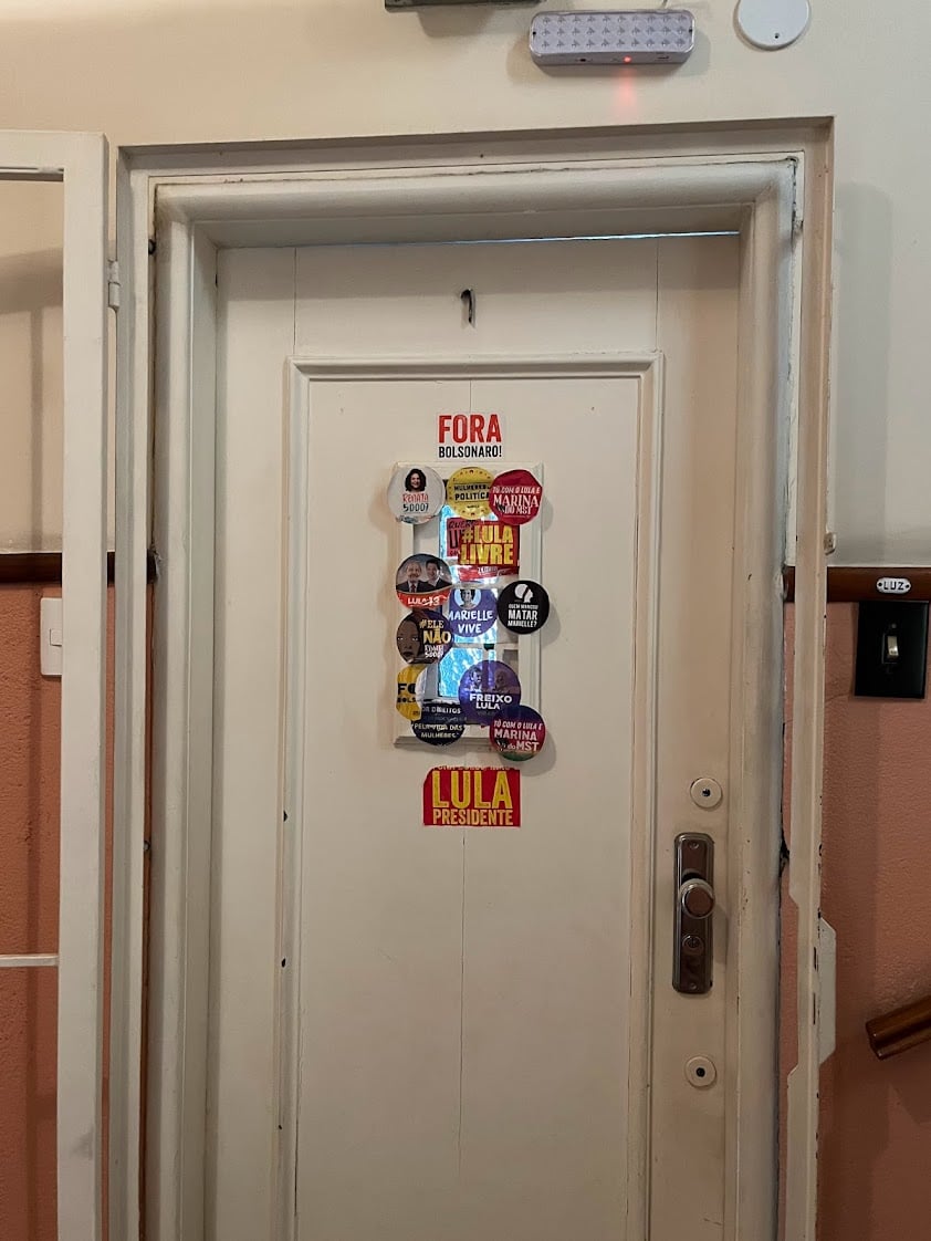 這Airbnb套間位於一座Art Deco公寓小樓底層,比街面低許多,提著行李箱步下螺旋狀石階,有深入地心之感。十月將要大選,某些人家在門口貼了支持盧拉的政治貼紙。 開門進屋,K立刻說跟預想落差很大,三個人擠著恐怕非常局促。 他太累,倒頭便睡,我拉上窗簾。 那所謂2nd suite(第二個套間)其實是貼著山邊的一個小房間連浴室,跟主居室不在同一平面,而需要走出露台、步下鐵扶梯方能到達:走進其室內,一股霉味撲鼻。 看來蕤只能睡在「樓上」進門小廳的沙發床上了。 那張床與主臥僅以鑲玻璃的活動門相隔,彼此都缺乏隱私。