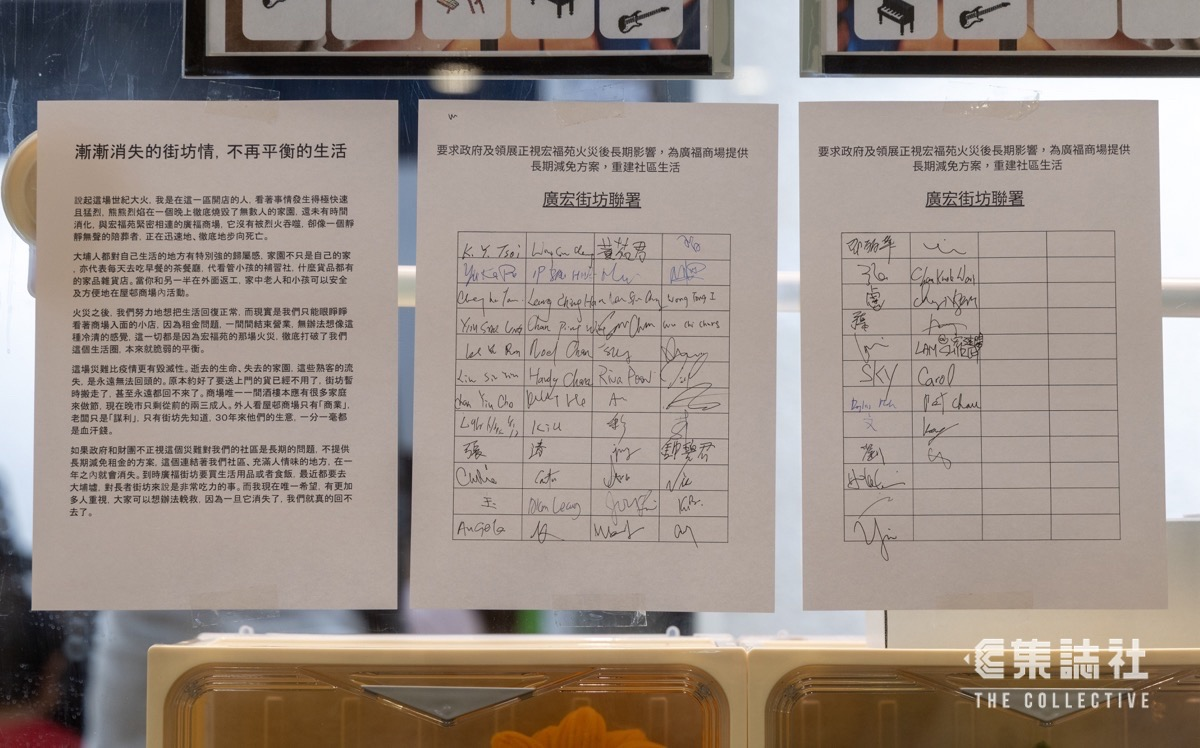 連日來,商場的麵包店關門、街市有一檔菜檔、一檔豬肉檔沒再營業。Heidi 不想看到商戶慢慢消失,於是在邨內做問卷,整理商戶生意受影響的數據,一起商議可行的減租方法,又草擬聯署,收集街坊、商戶的簽名。聯署中,他們提到,「與宏福苑緊密相連的廣場商場,它沒有被烈火吞噬,卻像一個靜靜無聲的陪葬者,正在迅速地、徹底地步向死亡。」