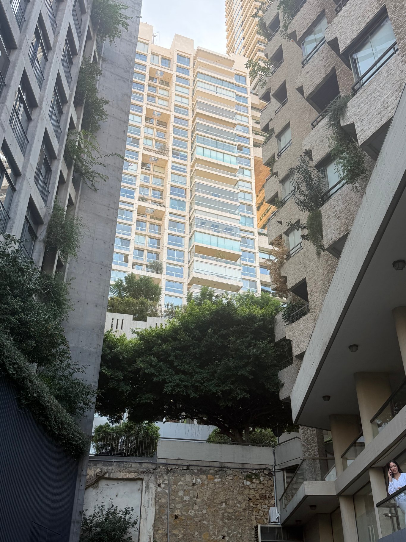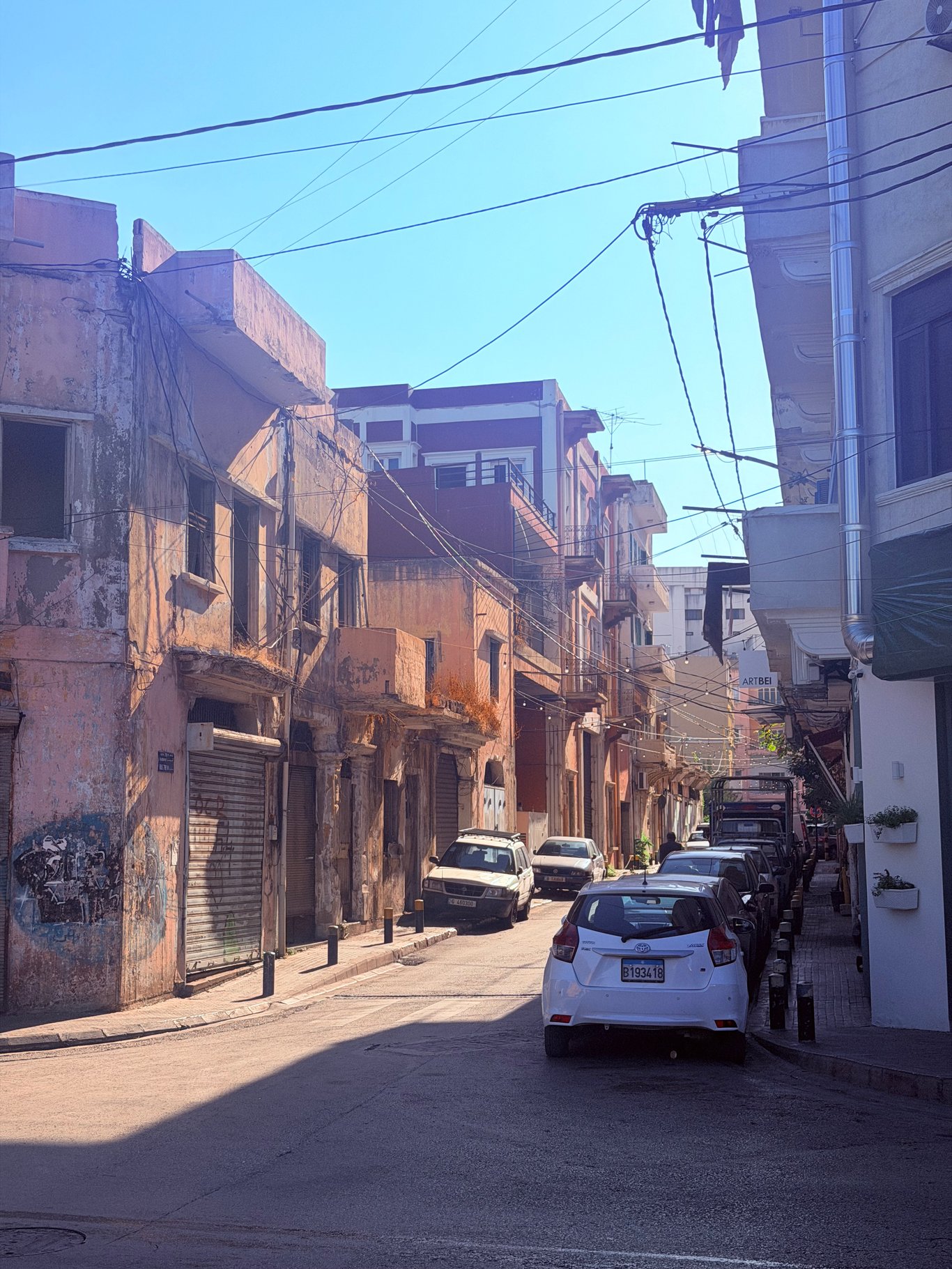 但走不到十分钟,一切突然安静下来。空气变得清爽,树影干净得不像同一座城市。房子的线条从斑驳破碎变成了锋利、洁净、近乎“全球化”的美学,像是谁把贝鲁特的场景换成了某个地中海上的隐秘富人区。那些房子的表面光滑得不合时宜,你一看就知道不是普通的工程队能造出的,背后一定有设计师的名字,只是未必印在门口。