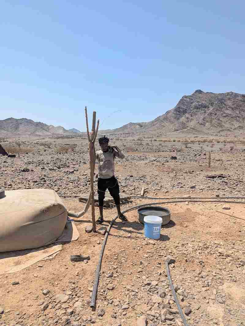 在从麦地那到麦加的路上,我再一次偏离高速公路,打算去哈拉特•拉哈特 (Harrat Rahat)火山遗址看看。这座火山最近一次爆发发生在1256年,流出的岩浆差点把麦地那毁掉。但我没想到这是一大片岩浆区域的总称,我没找到火山口,只看到成片的黑色火山石散落在戈壁滩上,仿佛我们来到了月球表面。不过,我们在这里遇到了一位来自埃塞俄比亚的牧羊人,他一个人住在一幢临时搭起的小木屋里,依靠从外面运来的饮用水和青草饲养着一群阿拉伯绵羊。可惜他不会英语,当他说Ethiopia时,我立刻跟了一句Addis Ababa!这就是我俩唯一的有效交流。