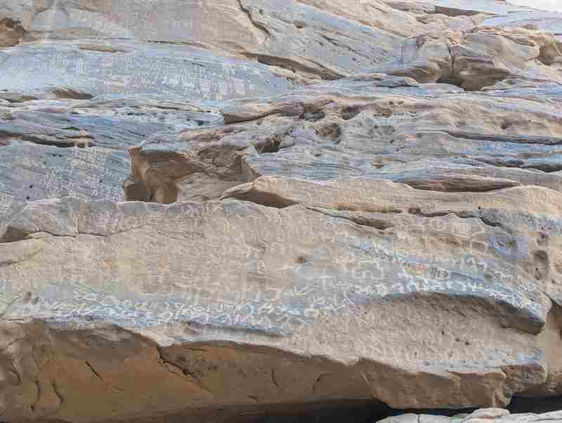 相比于纳巴泰陵墓,我更喜欢和达丹(Dadan)王国有关的古迹。达丹王国的存在时间比纳巴泰要早大约500年,他们留下的陵墓要比玛甸沙勒更原始一些。不过,达丹人在伊克玛山(Jebel Ikmah)的砂岩上留下了大量文字涂鸦,被认为是阿拉伯文字的祖先,这地方因此而被当地人称为露天博物馆(open library)。