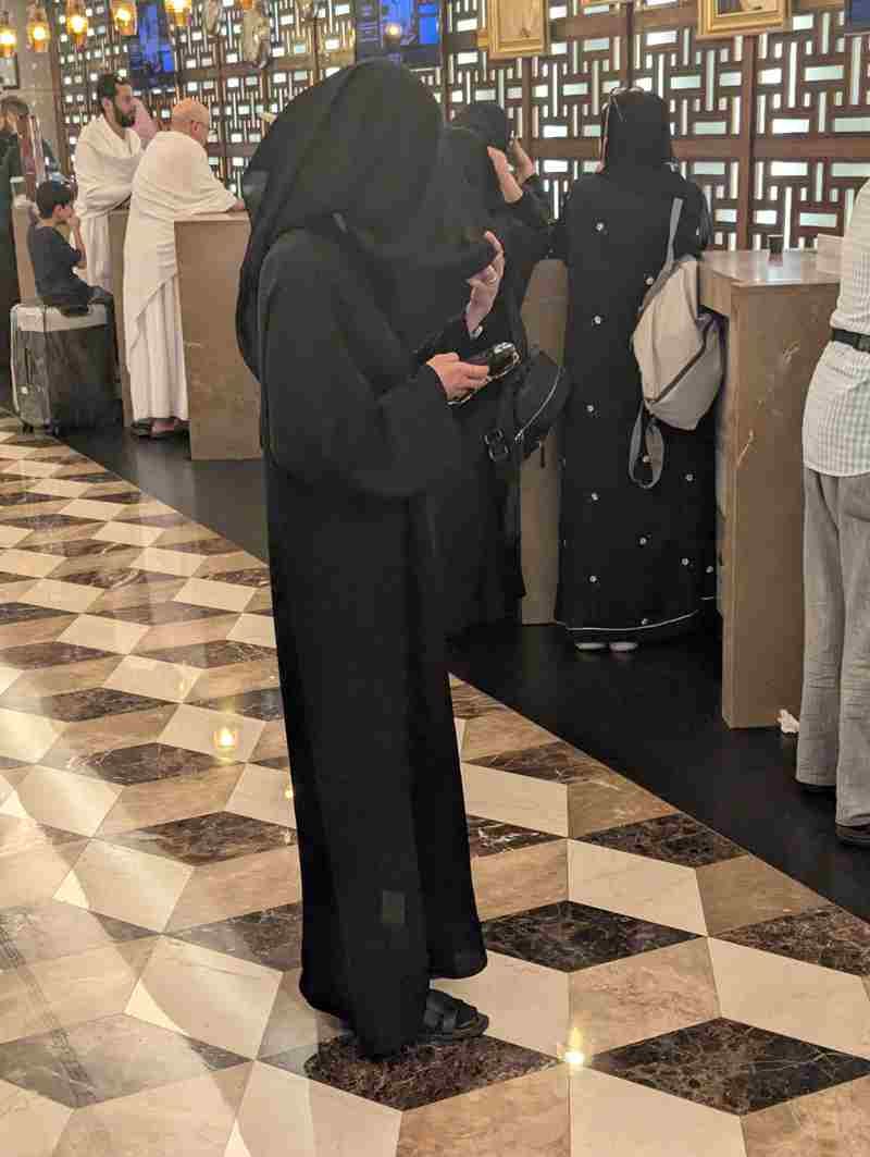 大街上甚至有些沙特女人连眼睛都遮住了,但因为黑袍布料的质地很薄,走路应该是没问题的,看手机就不行了,于是我经常可以看到沙特妇女掀开眼帘看手机,样子甚是滑稽。不过,最滑稽的是看她们吃饭,必须先用左手把面罩掀开才能用右手把饭菜递到嘴边。不知道她们吃完饭后会不会用面罩擦嘴,倒也很顺手。