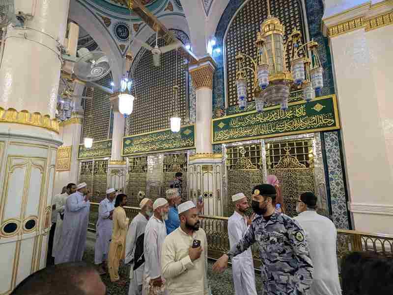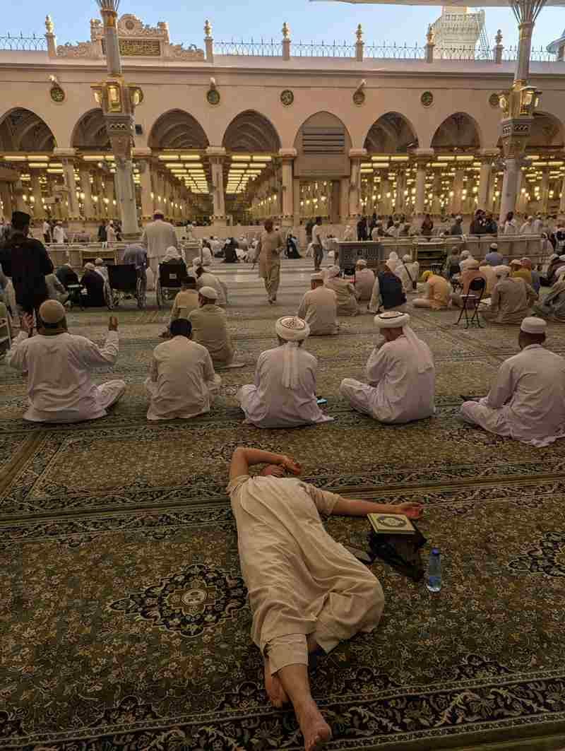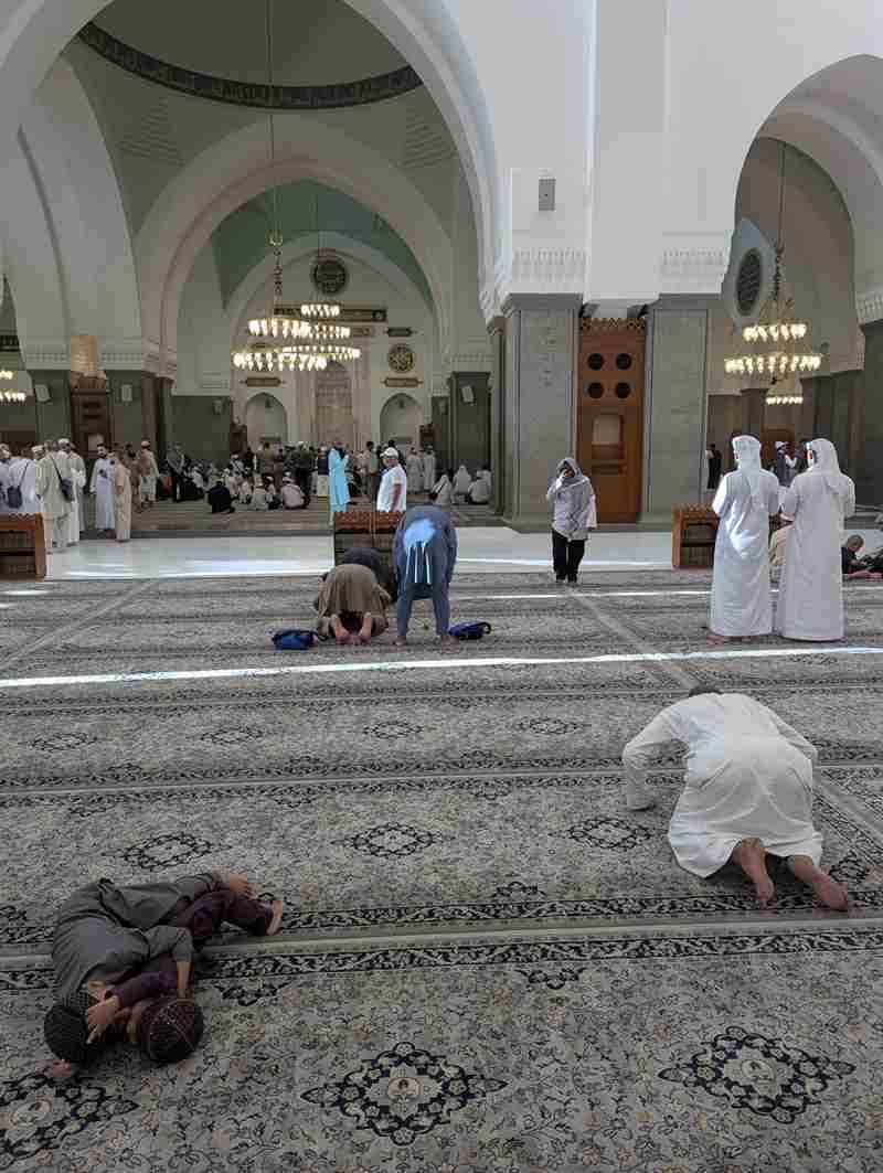 相比之下,麦地那要好很多。这座城市地势相对较平,不必建造摩天大楼,交通状况比麦加好很多。麦地那先知寺(Masjid al Nabawi)供奉着穆罕默德的陵墓,所以来此朝觐的人也很多。这里同样对着装并无特殊要求,只要不是奇装异服就可以进入参观。先知寺里没有转圈这种仪式,除了参观穆罕默德墓需要排队进入之外,其余的地方更像是休息室,大家随意地坐在地上读书冥想,孩子们也像世界上任何地方的同龄人一样在地毯上随意打闹,开心得很。不过,这里男女是分开的,不像禁寺那样男女混在一起。