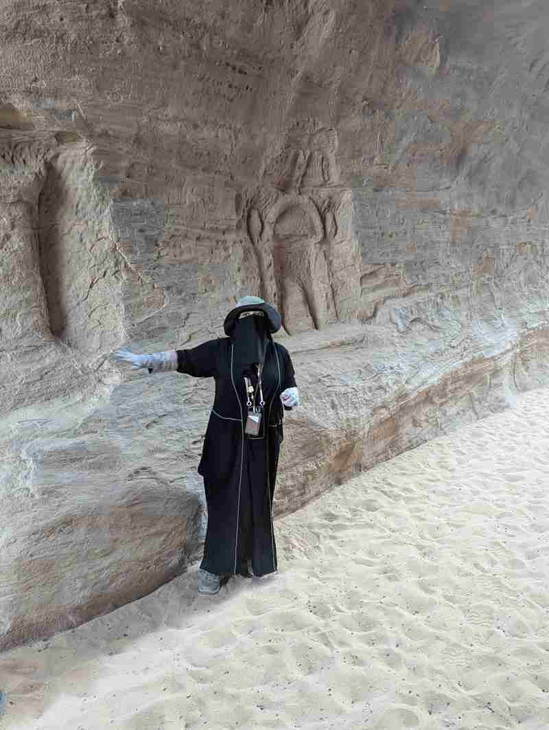 这趟旅行我只和一位沙特女性打过交道,这就是玛甸沙勒的一位女导游。她的英文不是很好,再加上嘴被面罩遮住了,看不清嘴型,导致我听她说话有些费劲,经常需要她再重复一遍。没想到后来她干脆改用中文了,原来她是中文系毕业的,还曾经去中国留过学。