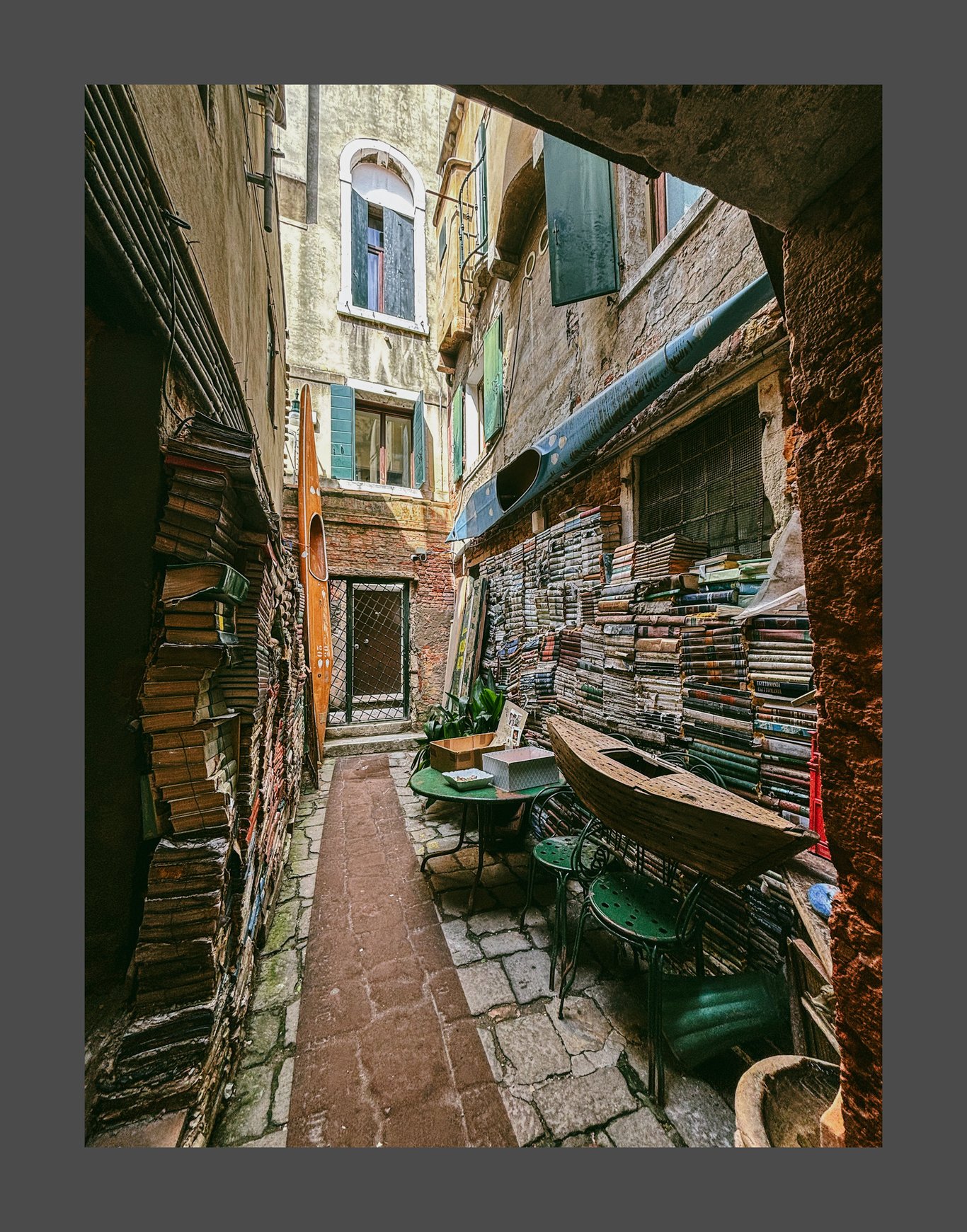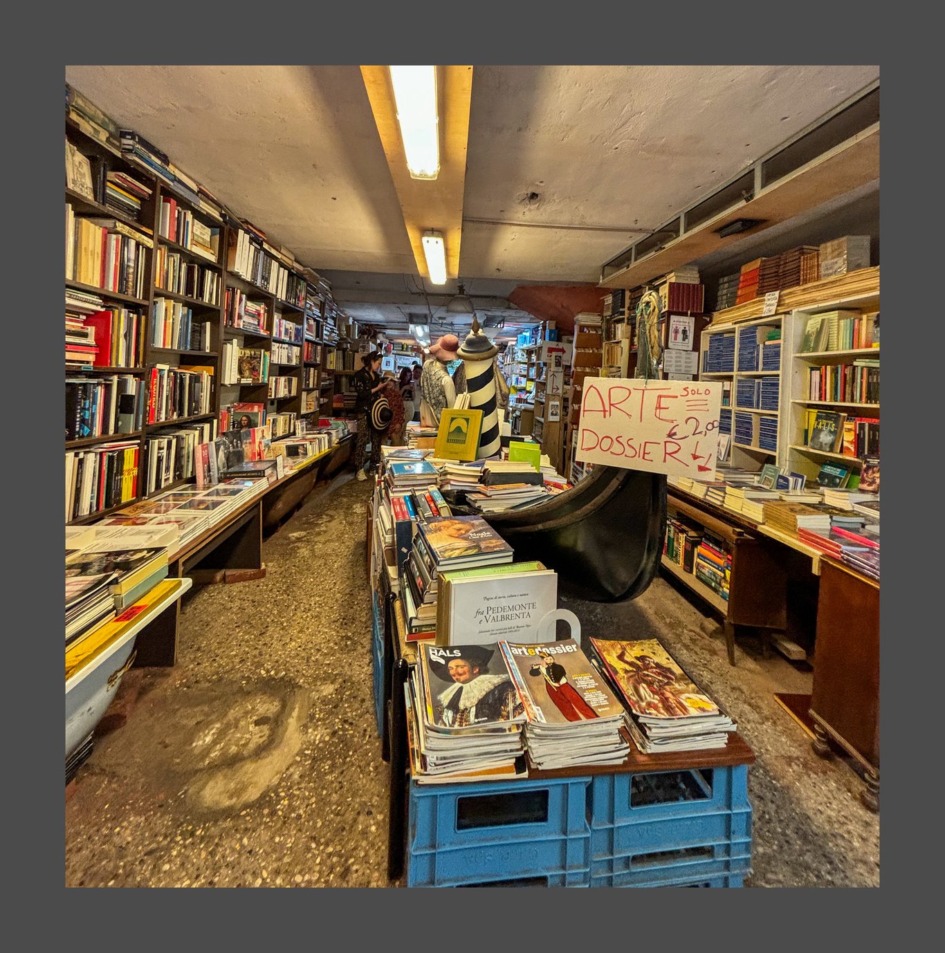 当地人或许可能在一摞言情小说中找到一本绝版意大利诗歌集,还有老明信片、复古海报和手工印刷的运河地图。对我们游客,看到的却是一种威尼斯人回应城市脆弱性的幽默和坚韧。