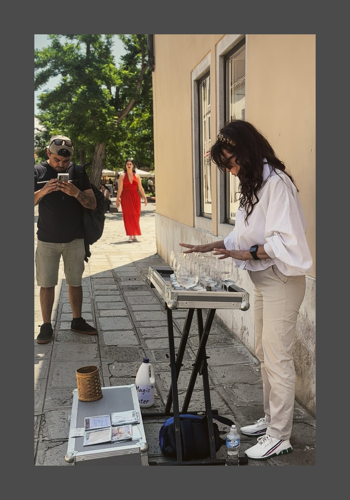 一路走走逛逛,来到广场上,场边的小屋前,有位女郎在演奏玻璃琴。这种奇妙的玻璃琴大约由20只高脚杯组成,每个杯子里不同水位代表着不同音阶。她用指尖沾上水,在杯口摩擦,发出悦耳的声响。路边聚集了不少如我们这样的看客,感受着它与众不同的魅力。后来才知,18世纪玻璃琴演奏风靡一时,连莫扎特都曾为这种乐器作过曲。