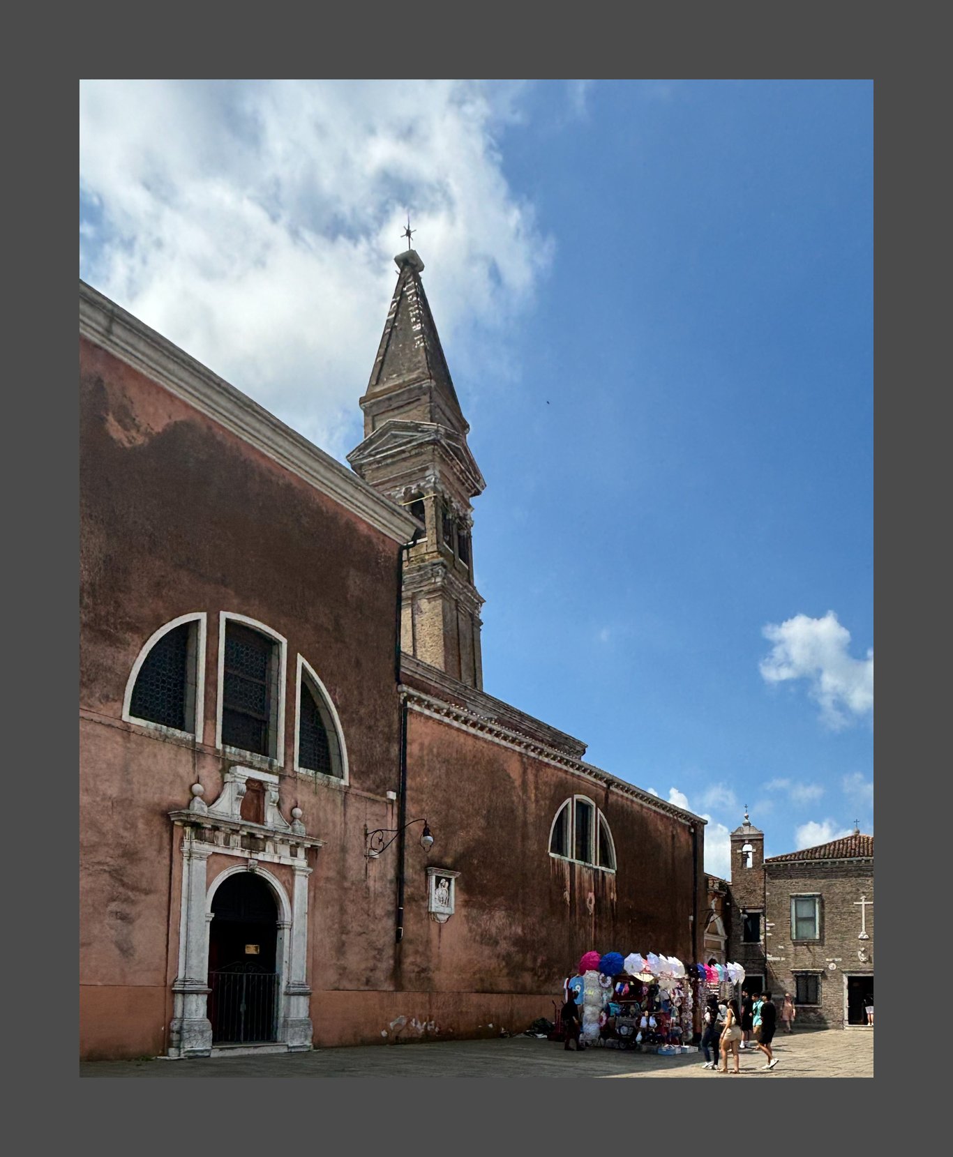 约莫着布拉诺不远了,对岸一座规模不如圣马可堂宏大,却也相当华丽的砖红色哥特式建筑映入眼帘。当时并不知道它的名字,但是那威严有派头的气势告诉我们,这座建筑一定来头不小。后来一查,果然。是赫赫有名的果园圣母堂,丁托列托葬在这里。教堂内藏着十幅他的作品,著名的有《最后的审判》《崇拜金牛犊》和《圣母显现》。