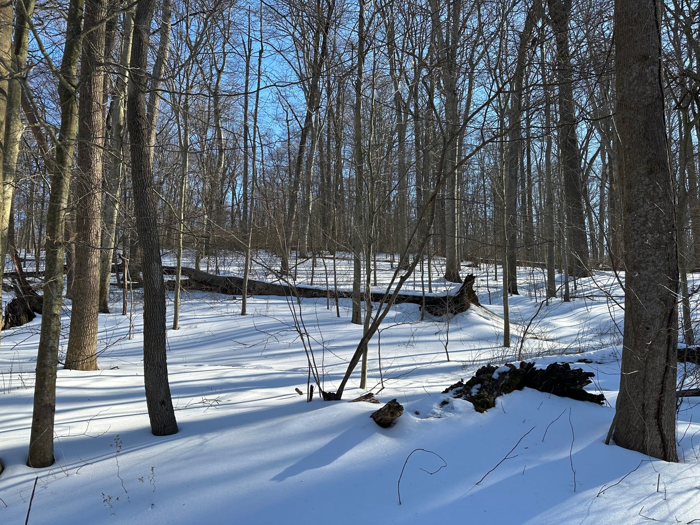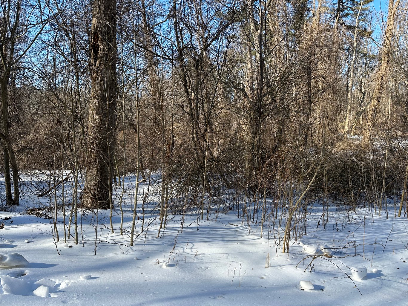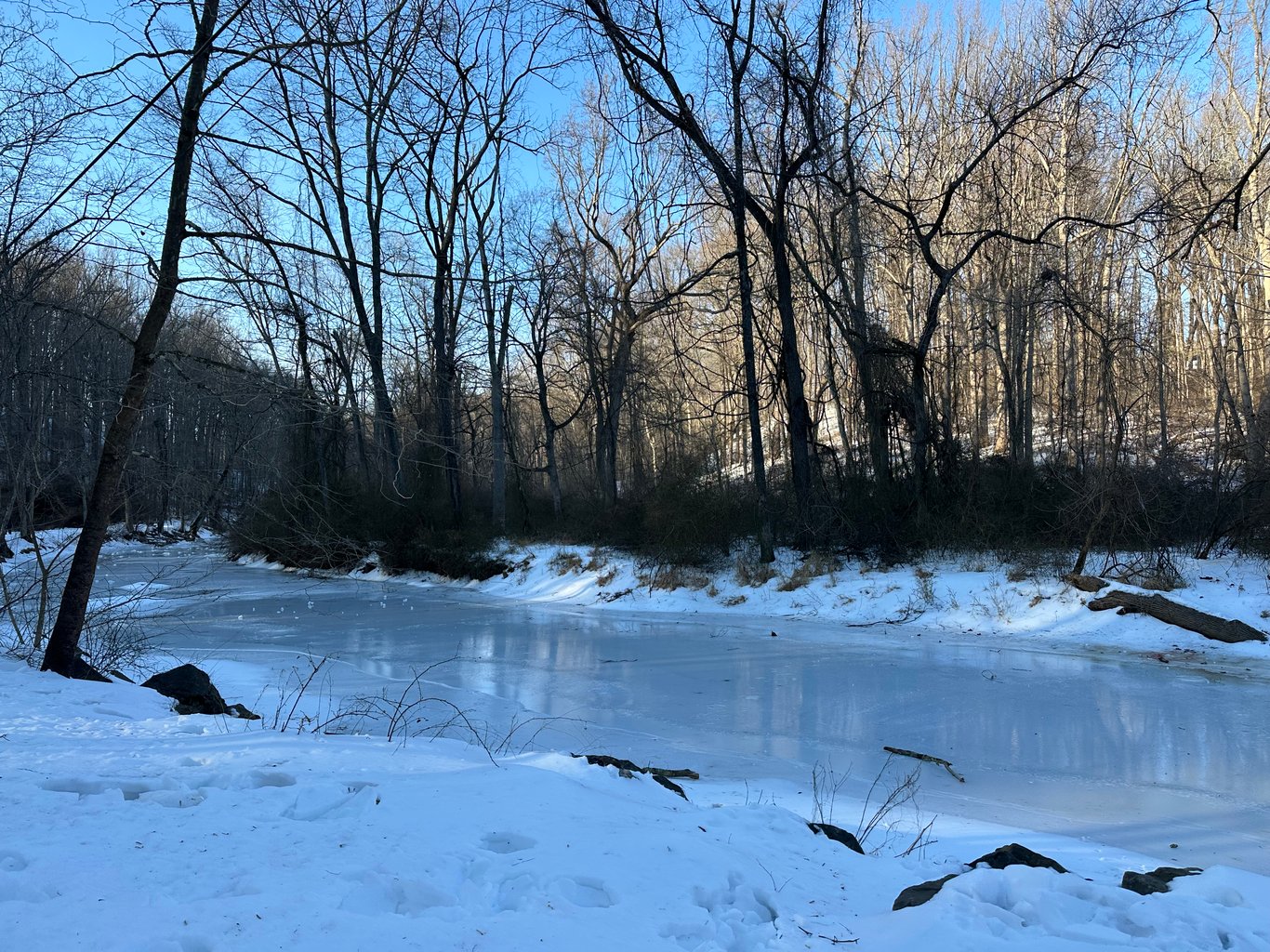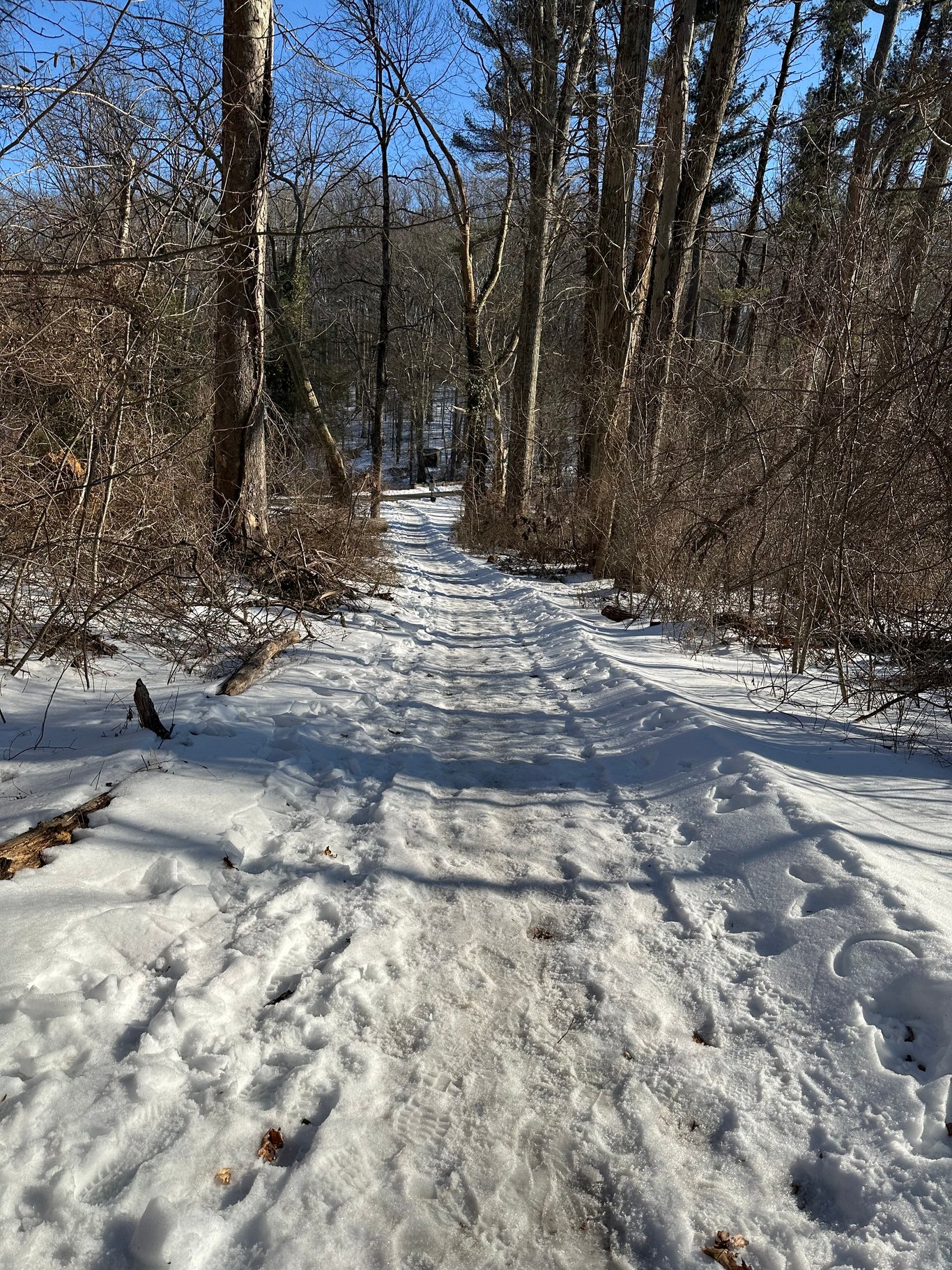 下雪后,反而天气转暖。那周末,我们决定到林间去走走。这个在溪涧边的林边栈道,要从停车场下去,需要经过一条狭窄的下坡小路。之前有一次下雪后我们也要过来走。结果因为极寒天气,路面滑得不得了,为了安全,我们只能掉头就走。