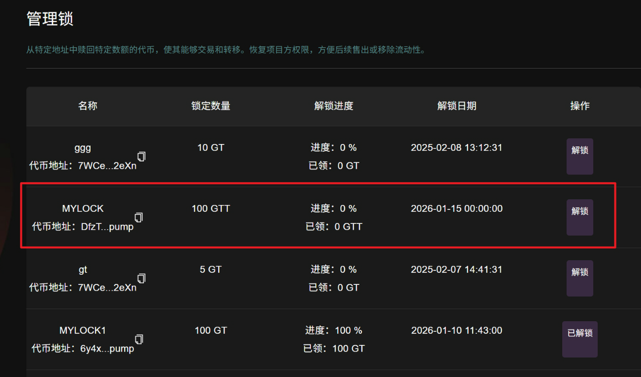 不可逆:一旦创建并确认,代币就真的锁住了,在解锁日期前任何人(包括你自己)都无法提前取出
