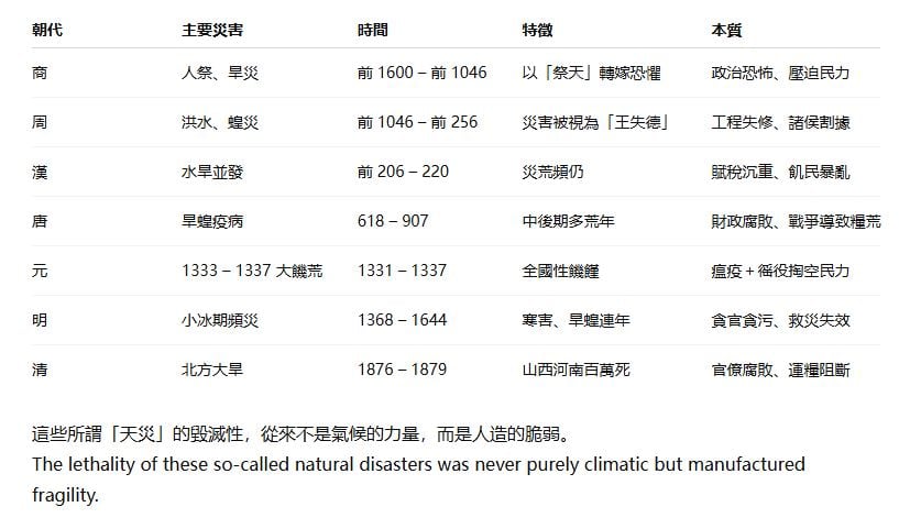 即使不考虑气候突变、地震、洪水这些自然因素,单靠制度失灵、赋税掠夺、资源分配不公,也可造成极端饥荒与大面积死亡。“天命 / 天灾 / 天谴”话语,是结构性暴力的神话包装