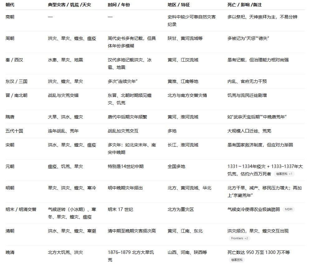 在此基础上,我们先给一个从商朝到清朝的“天灾 / 饥荒 / 洪灾 /瘟疫 /地震”时间线概览,然后在几个重点朝代中作深入拆解。