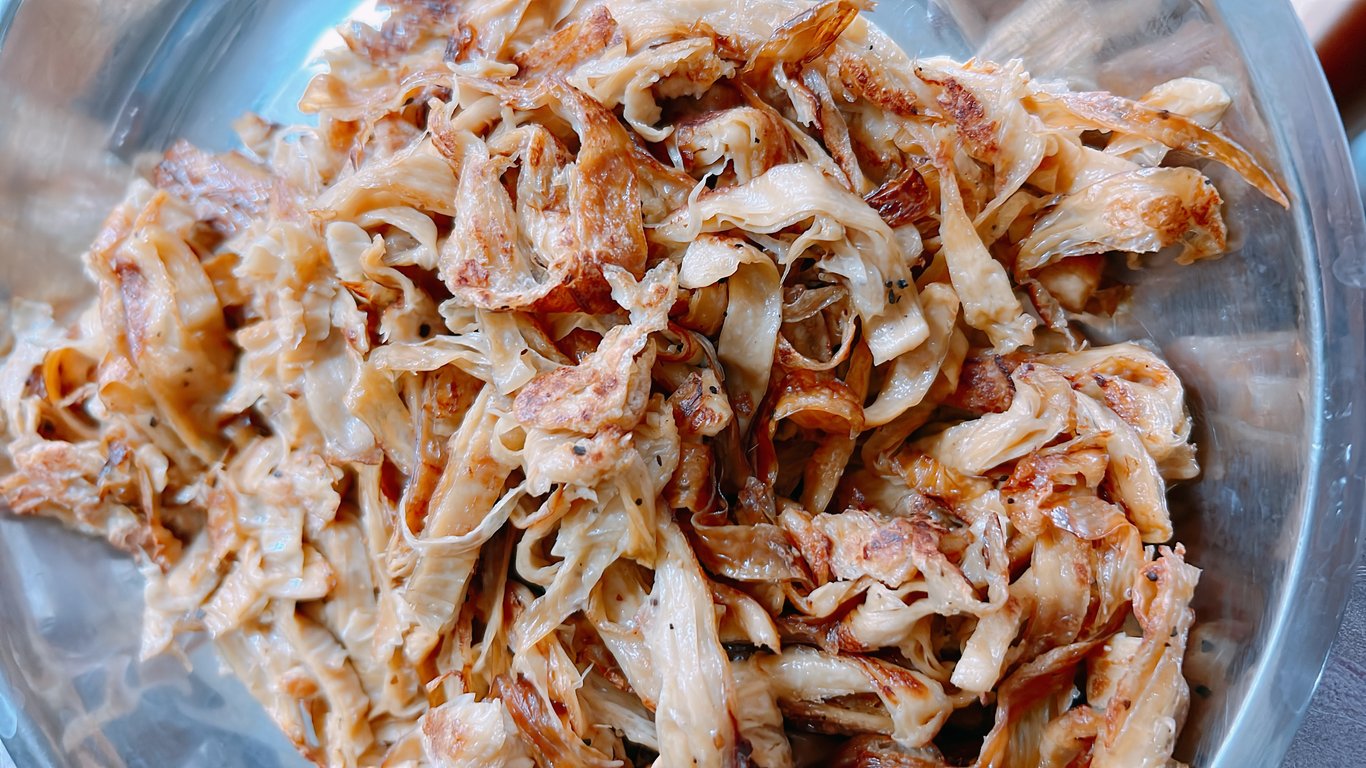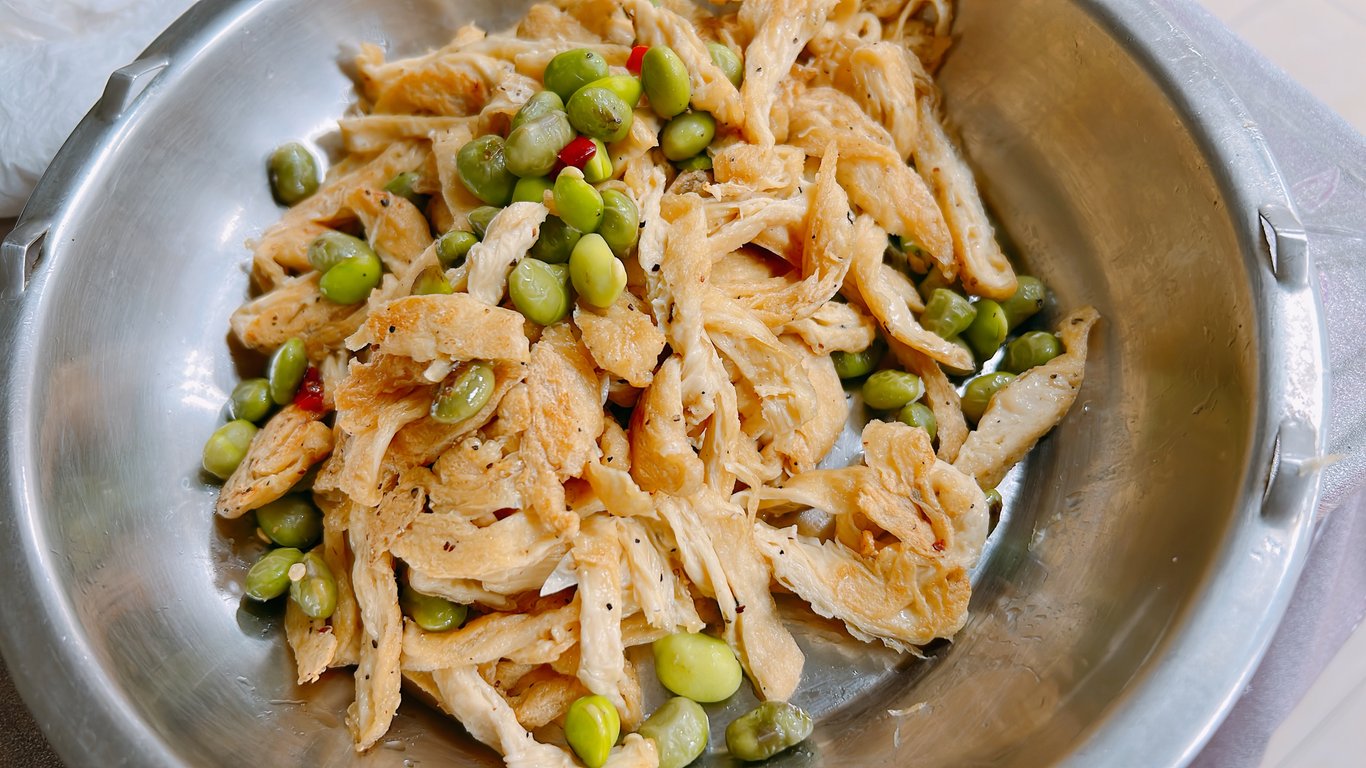 直接手撕成小條(整片不撕開直接下鍋也行),文火入鍋煎炒,煎得有些酥脆內里香軟,撒些胡椒鹽就很好吃。撕開後加入蔬菜一起炒,芹菜或者青豆(相片中用的是茶豆,青豆的攣生物),洋蔥或白菜,很多種蔬菜都合適。