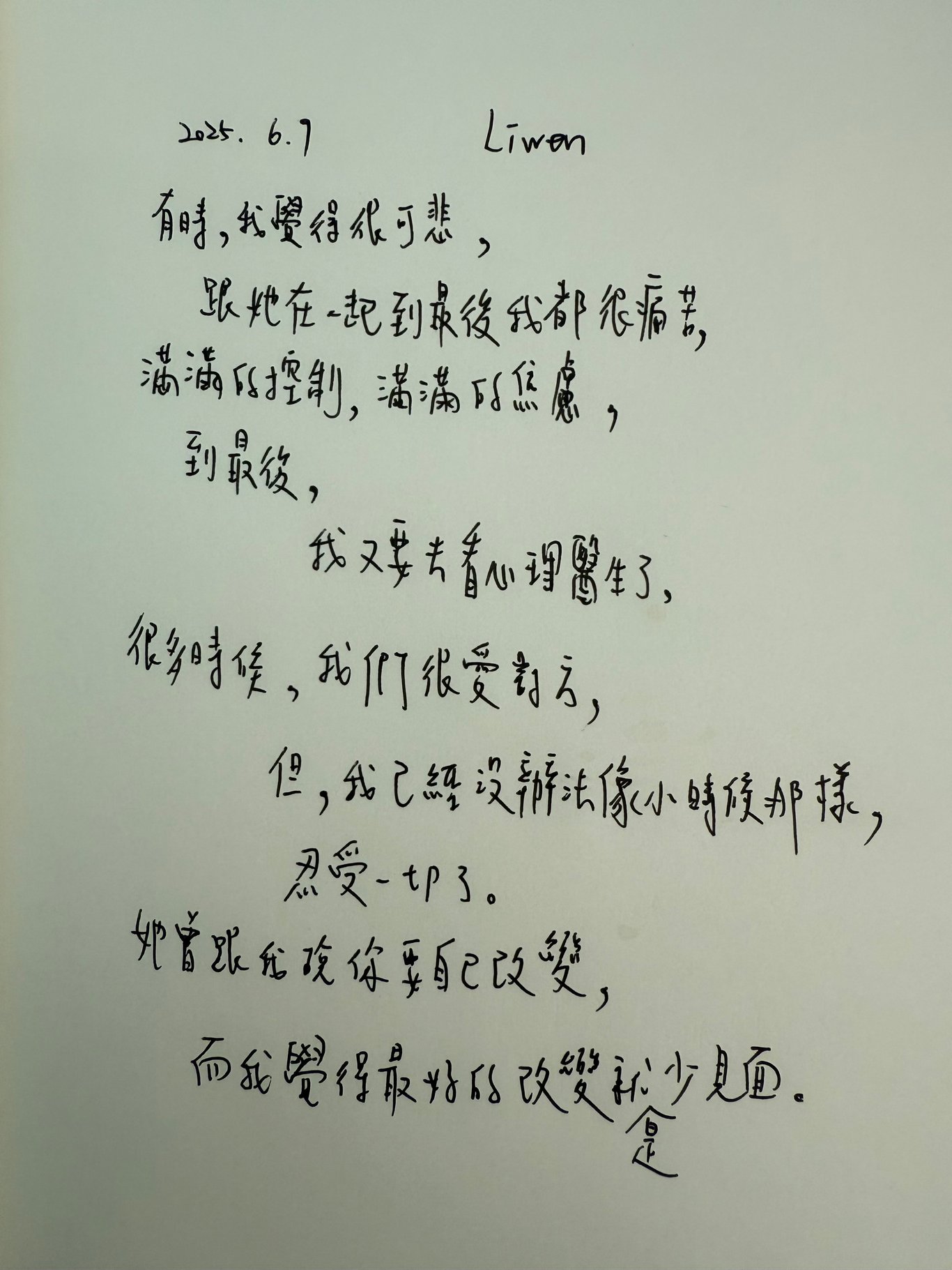 我發現自己內心還是有一種渴望,但每當我再一次嘗試,結果都是像我想的那樣,我發在臉書的分享,我的家人都跟鬼一樣最愛窺探我的一切,但他們實在是充滿焦慮跟一堆限制,當我有一個很棒的創作或者新的構想,第一個來攻擊我來反駁我的就是這些人,想一想我幹嘛跟這些鬼分享,反正他們也看不懂,只會一直限制侷限我,那些人說著道歉下一次還是一樣的習性又出現了,所以人真難啊,輪迴了一萬次還是會做出一樣的劣質行為。