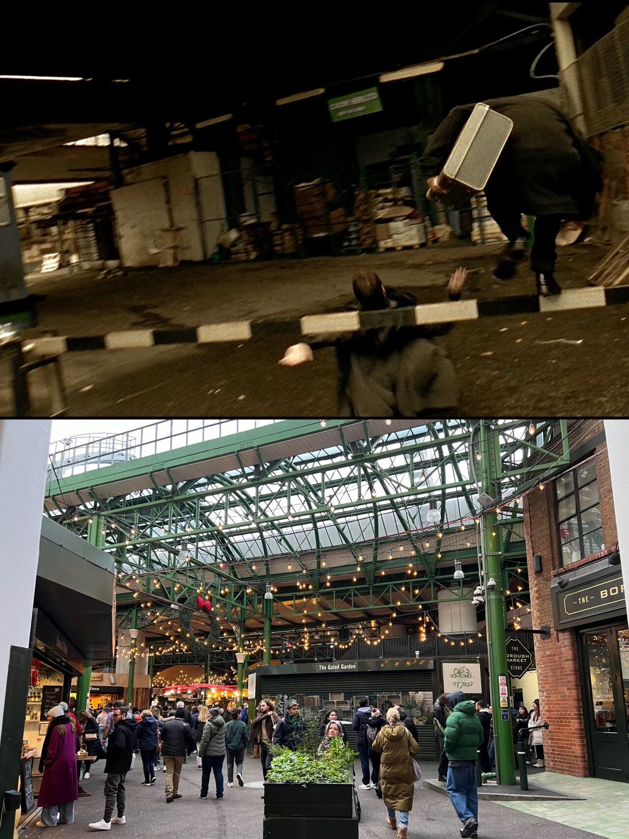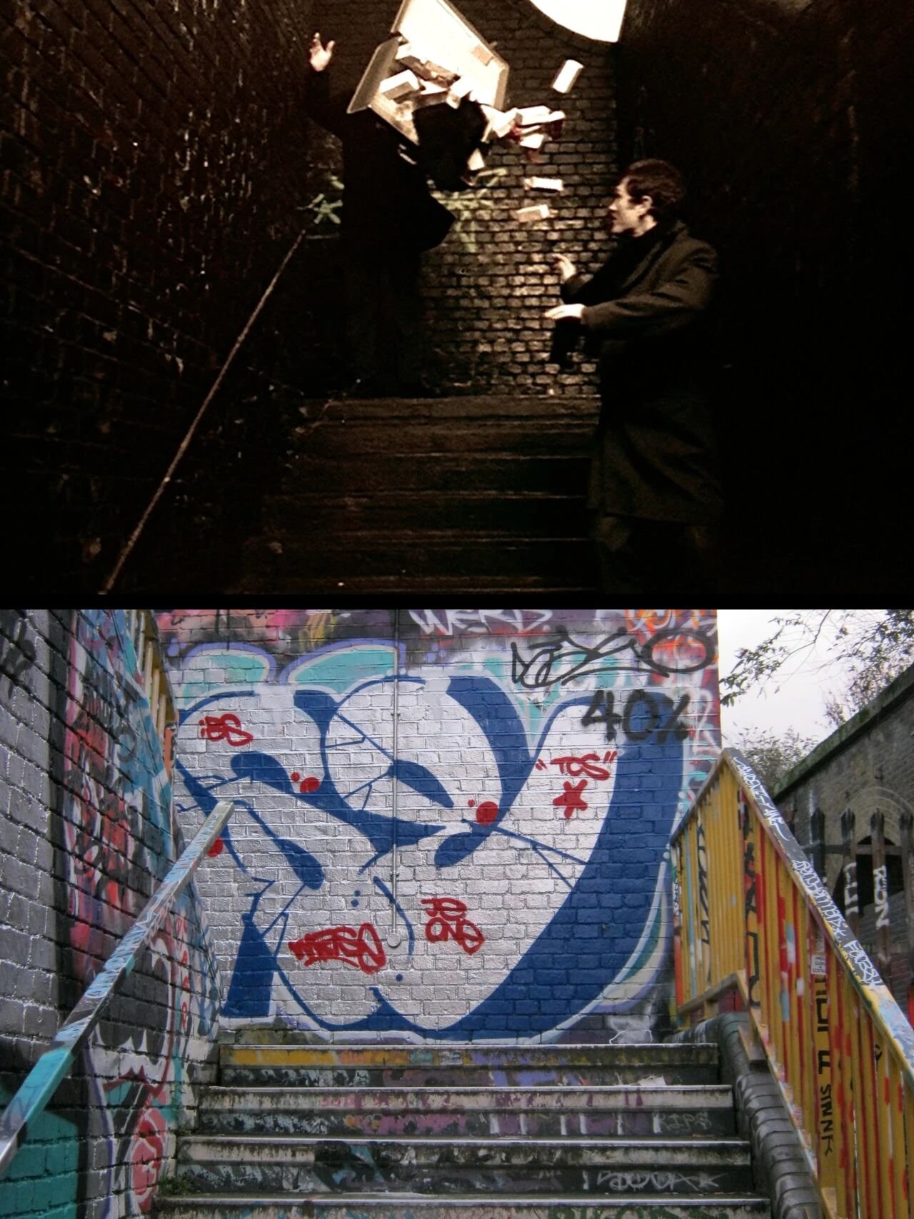 現如今的博羅市場已經成為了大賣場,各式各樣的手工藝品宛如來到了義烏小商品城,人多的也像過春節般熱鬧,可誰又能想到以前拍攝的時候只是一個廢棄的街道呢。20多年前在這裡貝肯和艾迪與警察間的追捕戲拉開了這一出黑色喜劇的序幕。影片的第一幕通常奠定了本片的基調,在第一場戲中,蓋里奇將攝影機隱藏在人群中看著本色出演的傑森斯坦森和艾迪演雙簧,那句“只此一次絕無僅有,因為那裡換鎖了”的台詞就頗具英倫笑料。警察入場後影片的節奏明快了起來,三人開啓了追逐模式,這裡背景音樂放的Hundred Mile High City是英國搖滾樂隊Ocean Color Scene的歌曲,帶感的節奏完美適配影片的整體風格。警察追著兩人一直跑到現已變成塗鴉牆的艦隊街山,在這裡蓋里奇祭出變速剪輯搭配升格鏡頭的技法讓這個單一場景充滿了漫畫風格,搭配畫外音竟有種說書的感覺。