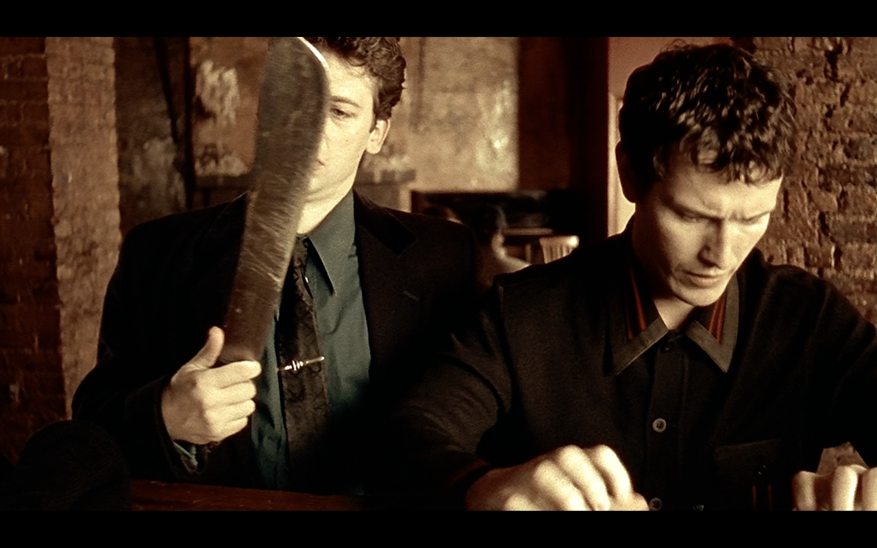 “人物的行為往往可以被主流觀眾理解和共情。”蓋里奇在《兩桿大煙槍》中更是把這句話使用到極致,片子中的所有角色都算不上好人,做的也更算不上好事,甚至還很臉譜化。所謂臉譜化就是沒有明顯的特質,僅有的艾迪和父親的設計也在正式版本中被刪減。可恰好是這樣的設計才讓影片充滿了後現代主義的黑色喜劇內核。蓋里奇放棄了刻畫在紛爭中人物的道德變化和轉變,這與傳統好萊塢電影強調的人物弧光完全不同。